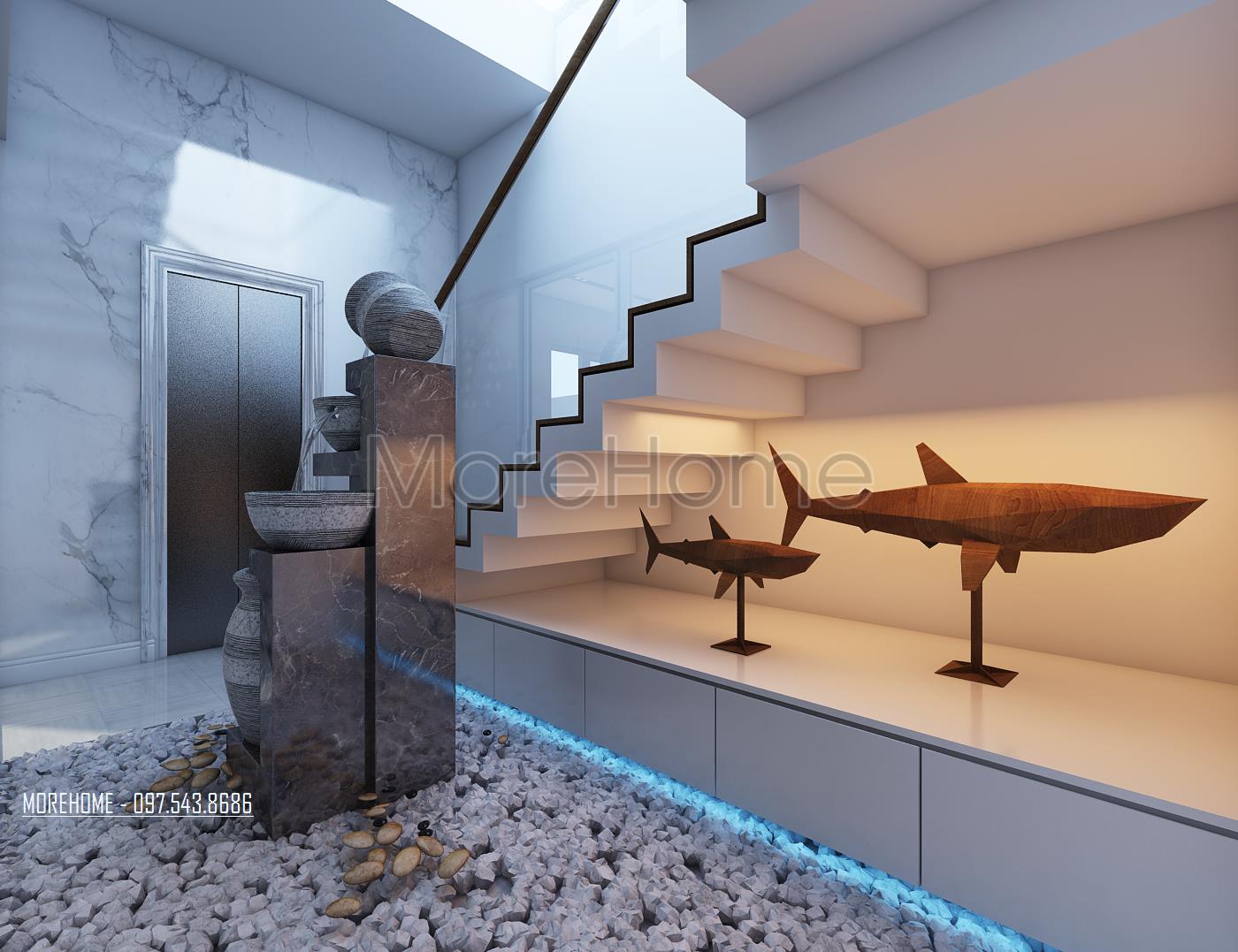 Đối với thiết kế nội thất, không gian gầm cầu thang thường là khu vực khá kén chọn thiết kế. Đặc điểm tối và ẩm thấp khiến nó trở thành khu vực muốn giấu đi của gia chủ. Tuy nhiên việc tận dụng kính cường lực mang ánh sáng tự nhiên vào căn phòng giúp hạn chế tối đa điểm yếu về ánh sáng ở vị trí này. Bên cạnh đó, kiến trúc sư còn tạo điểm nghỉ trang trí nhẹ nhàng giúp mang đến sự ấn tượng và điểm nhấn trong thiết kế.