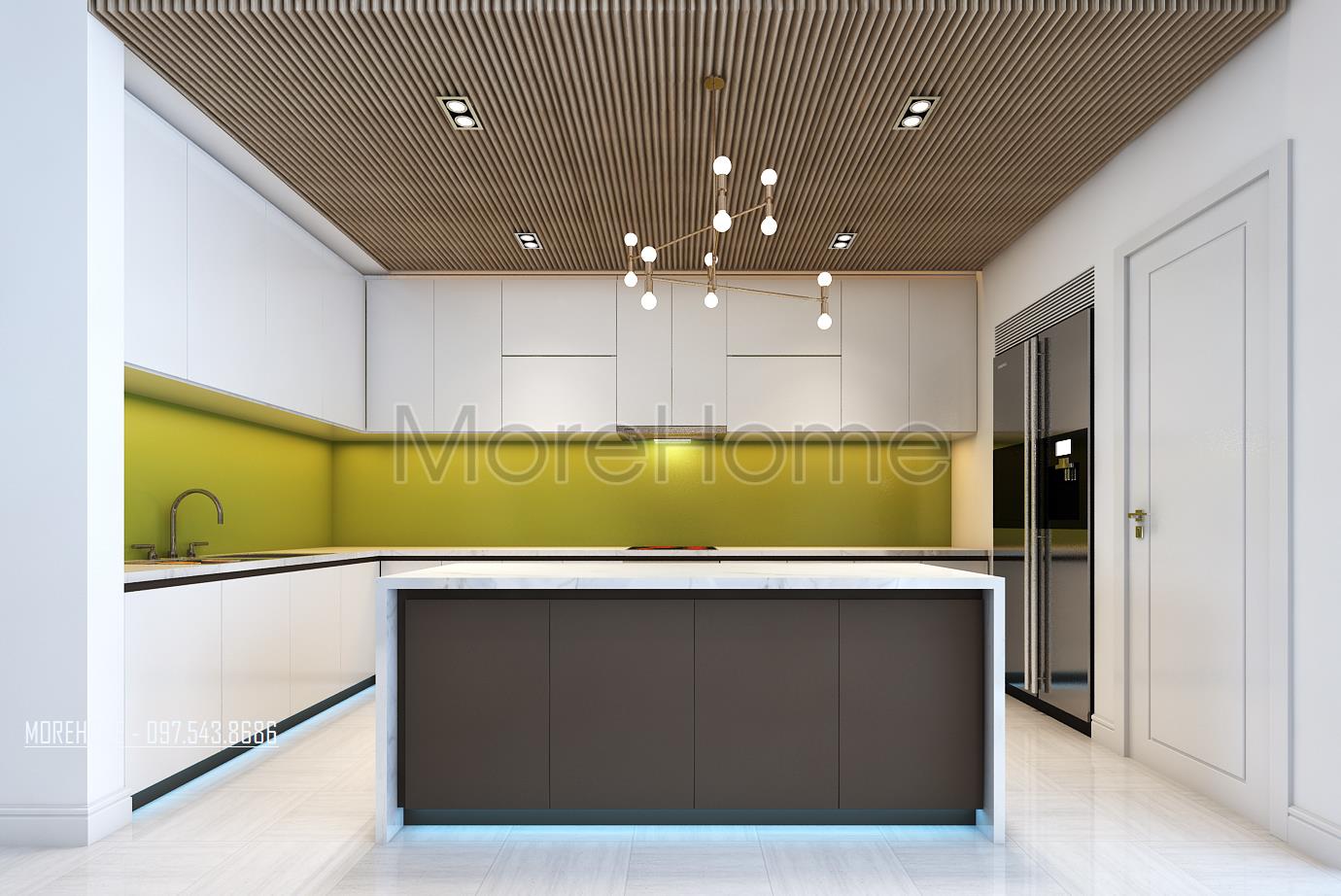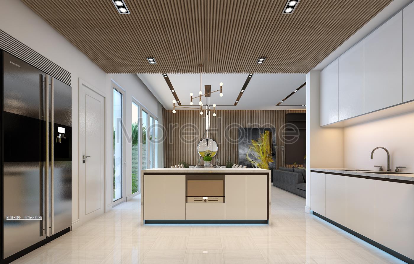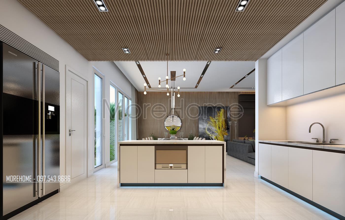 Thiết kế nội thất không gian bếp và bàn ăn liền kề không hề có vách ngăn giúp tăng diện tích mở cho căn phòng và tăng tầm nhìn, bao quát các hoạt động. Tủ bếp thiết kế kéo dài không tone màu trắng nhám đơn giản mang đến cảm giác hiện đại, tự nhiên cho không gian sống. Một điểm nhấn khá đặc biệt của thiết kế bép chính là trần nhà cách tân với chất liệu gỗ tự nhiên. Các thanh gỗ kéo dài tạo vân dọc khá đặc biệt vừa tăng độ thoáng lại tăng tính thẩm mỹ cho căn nhà.