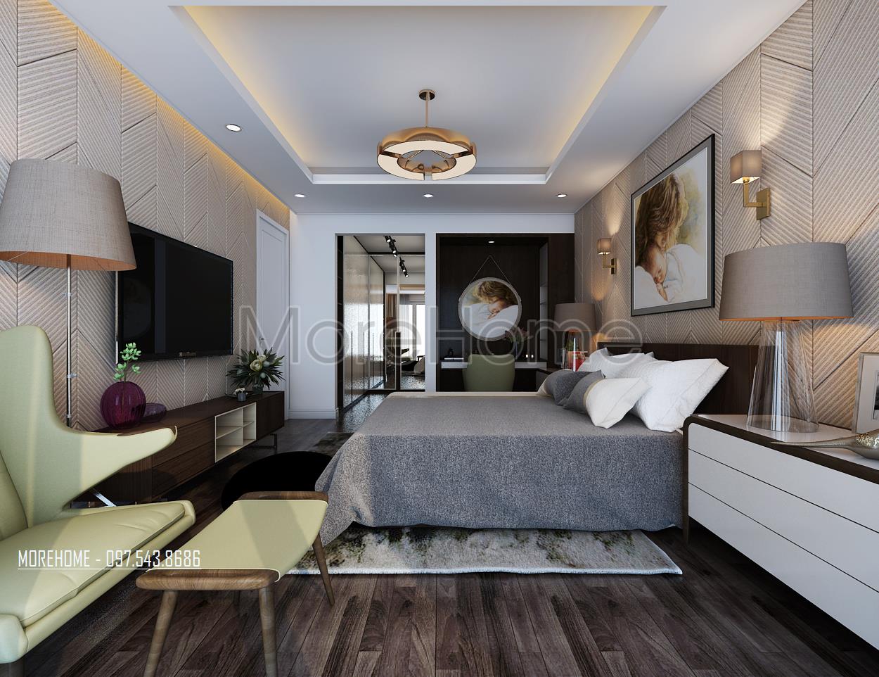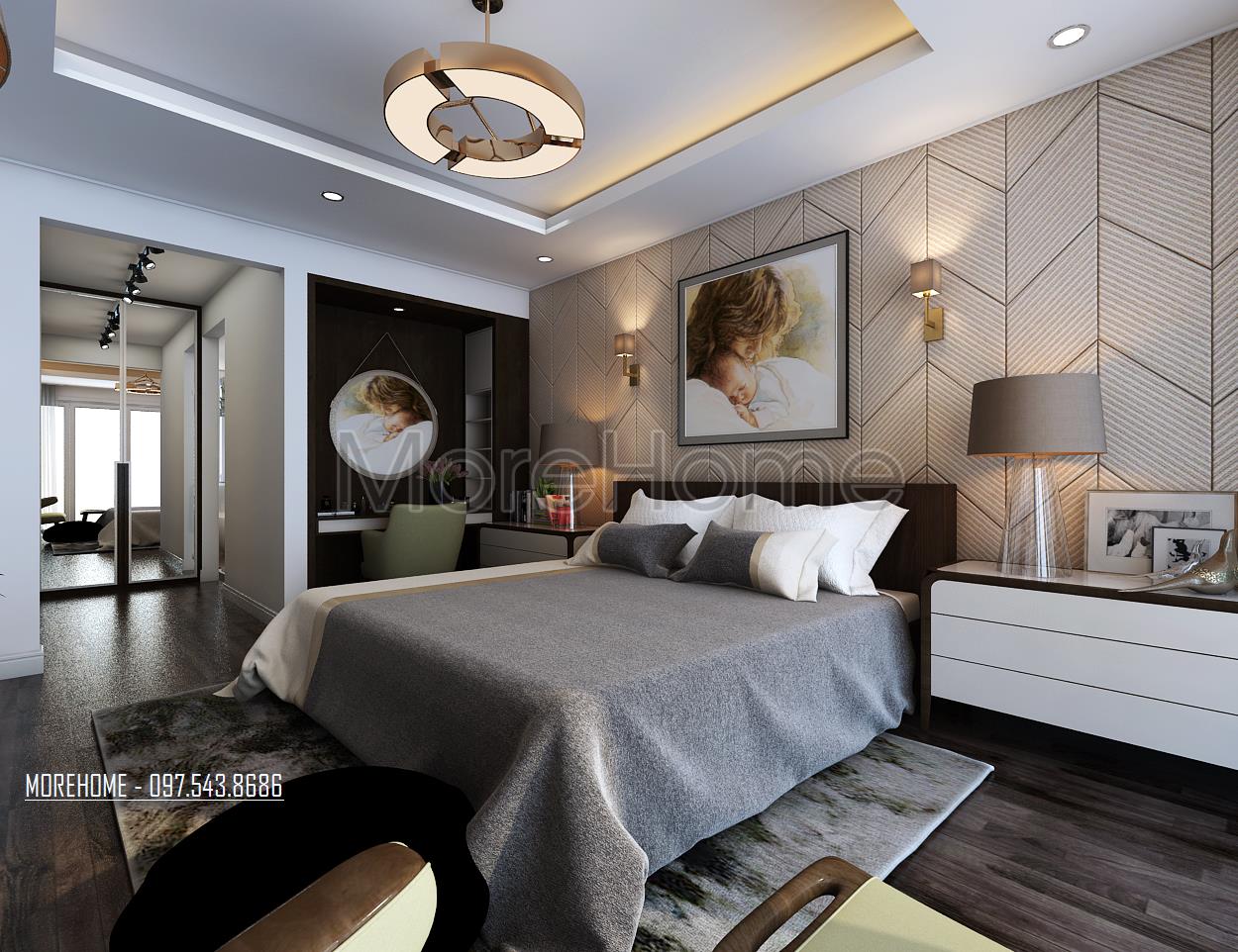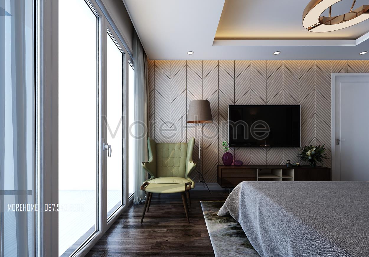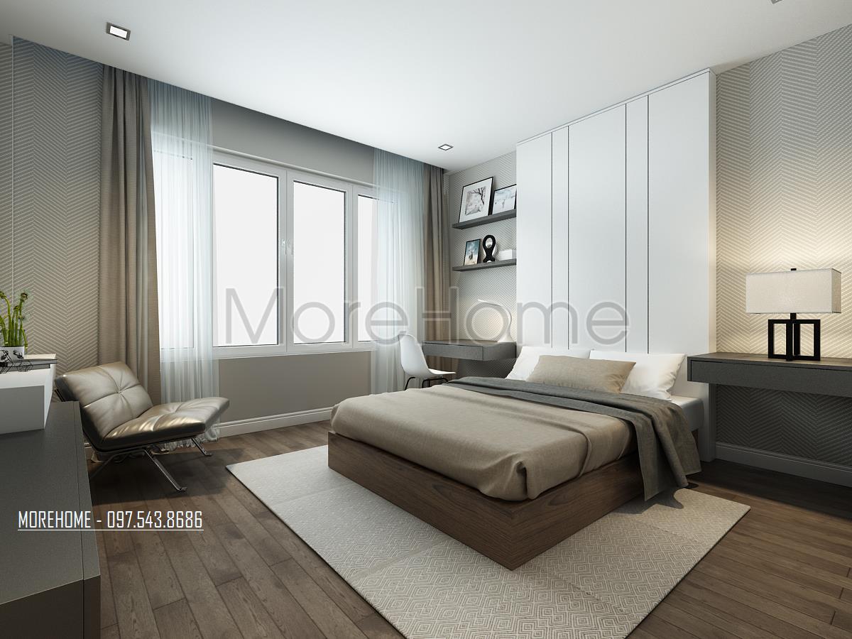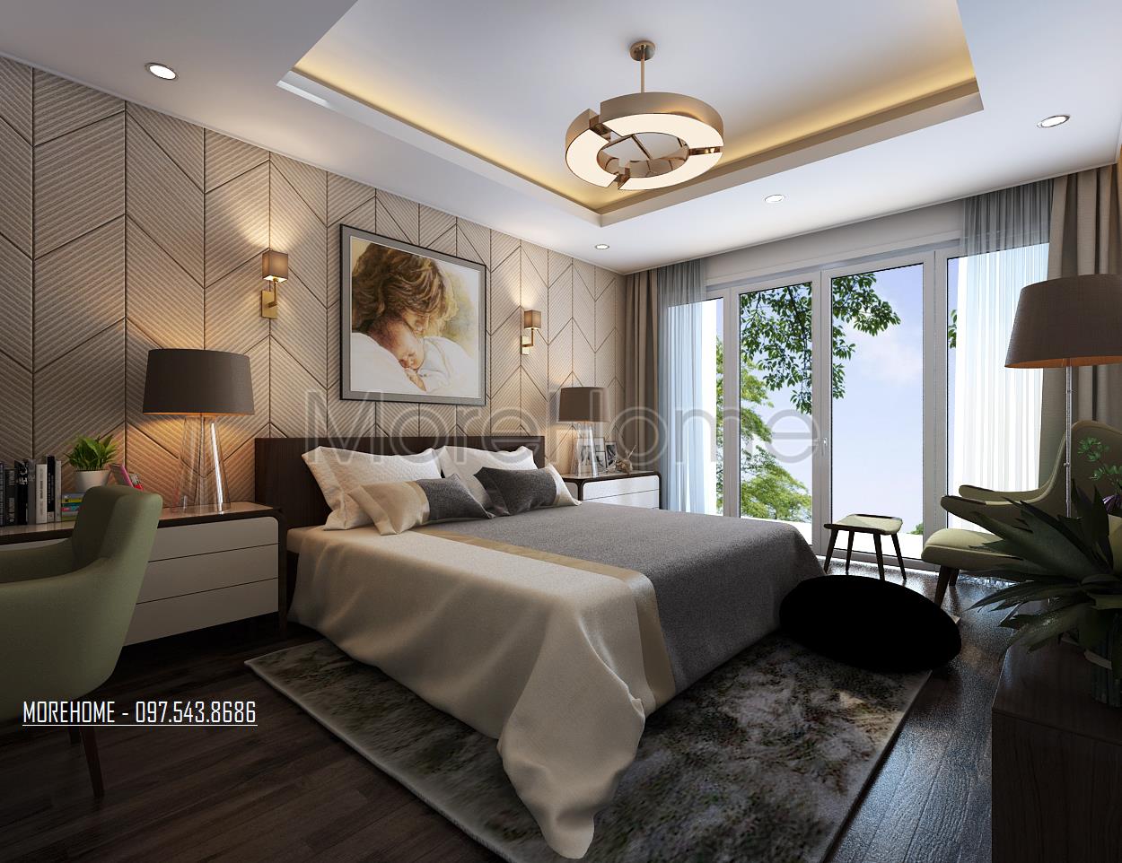 Thiết kế nội thất phòng ngủ phong cách hiện đại sử dụng tone màu nâu sáng làm chủ đạo mang đến cảm giác yên bình và ấm áp cho gia chủ. Mảng tường khác biệt vẫn là thiết kế được ưu ái hơn cả để tạo điểm nhấn cho không gian. Ngoài ra, khung cửa rộng với ánh sáng mở tăng độ thoáng và mở rộng view cho căn phòng.