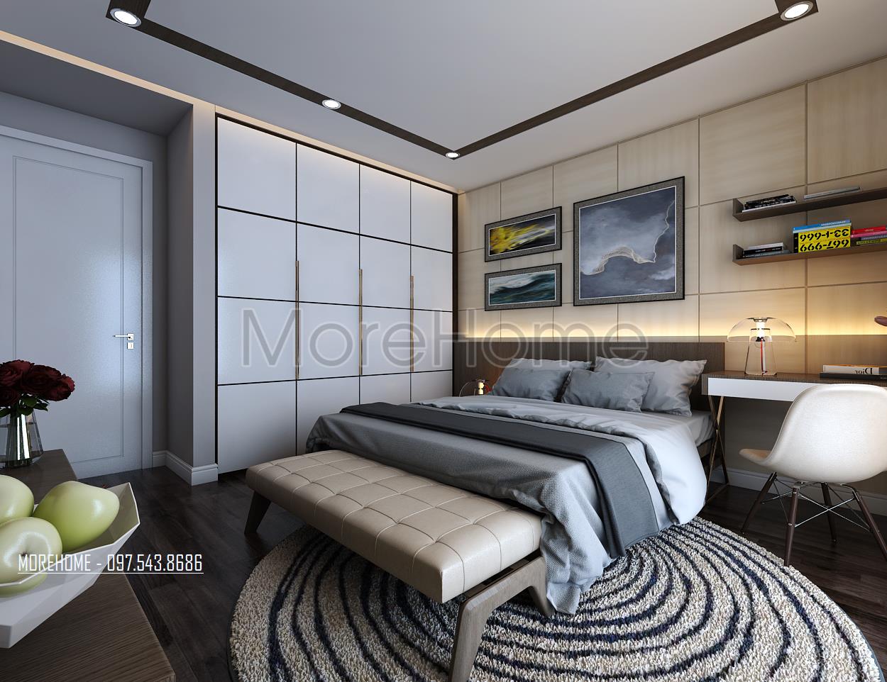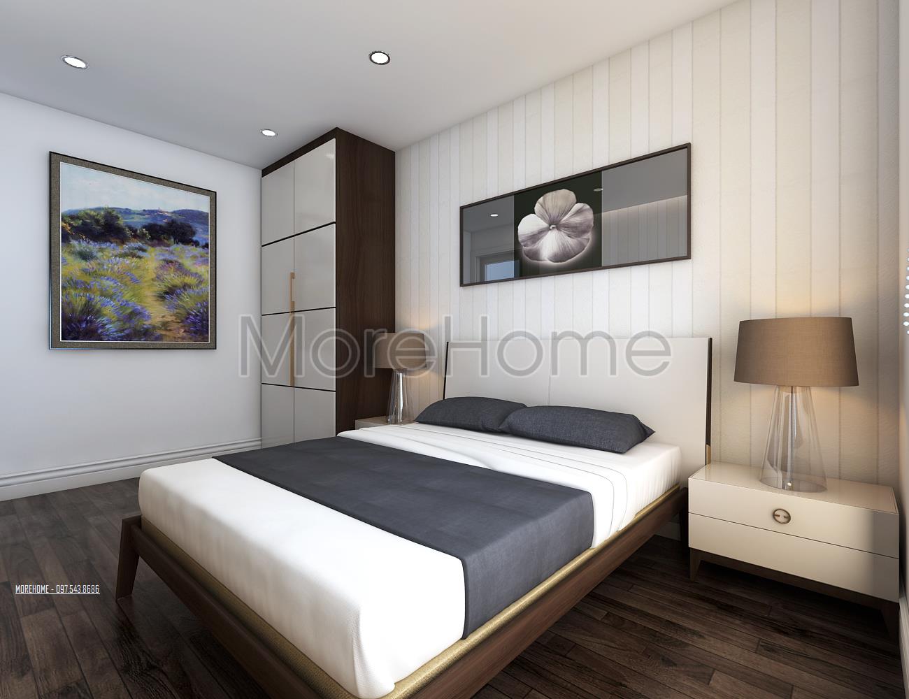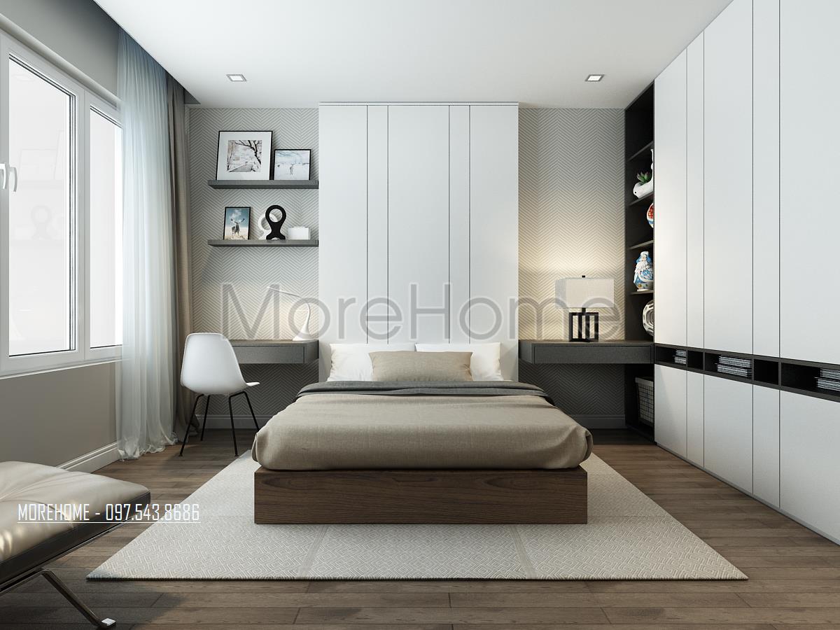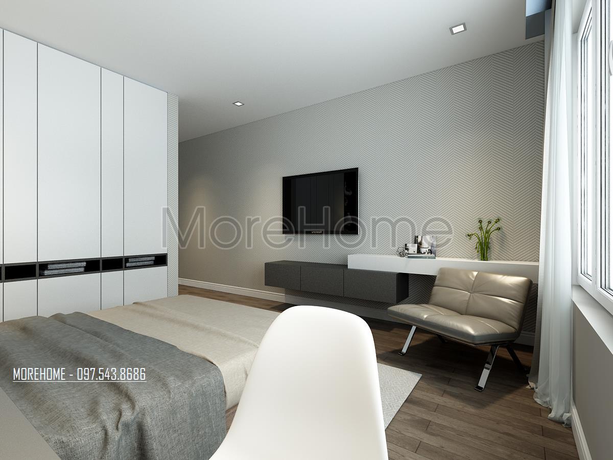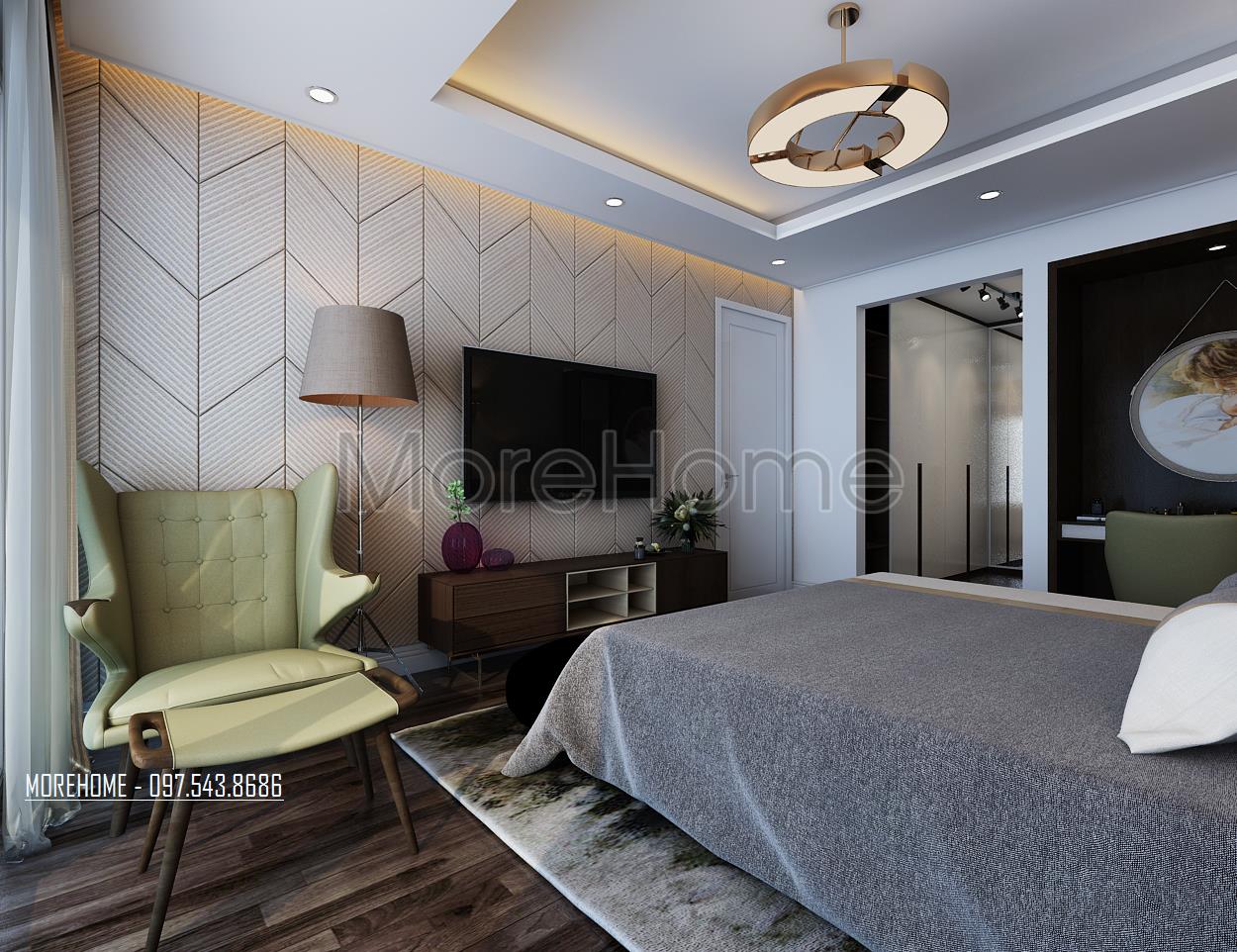 Thiết kế nội thất phòng ngủ phong cách hiện đại sử dụng tone màu nâu sáng làm chủ đạo mang đến cảm giác yên bình và ấm áp cho gia chủ. Mảng tường khác biệt vẫn là thiết kế được ưu ái hơn cả để tạo điểm nhấn cho không gian. Ngoài ra, khung cửa rộng với ánh sáng mở tăng độ thoáng và mở rộng view cho căn phòng.