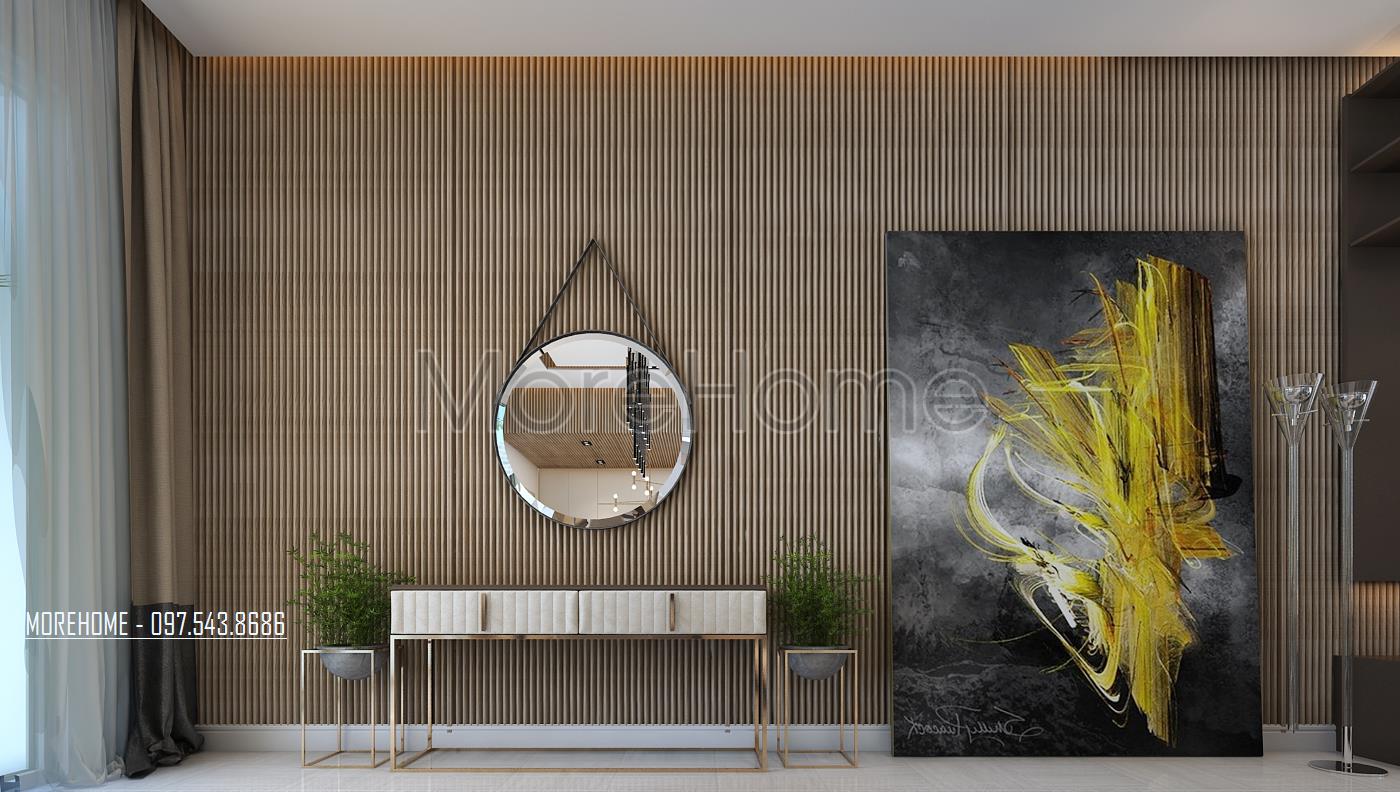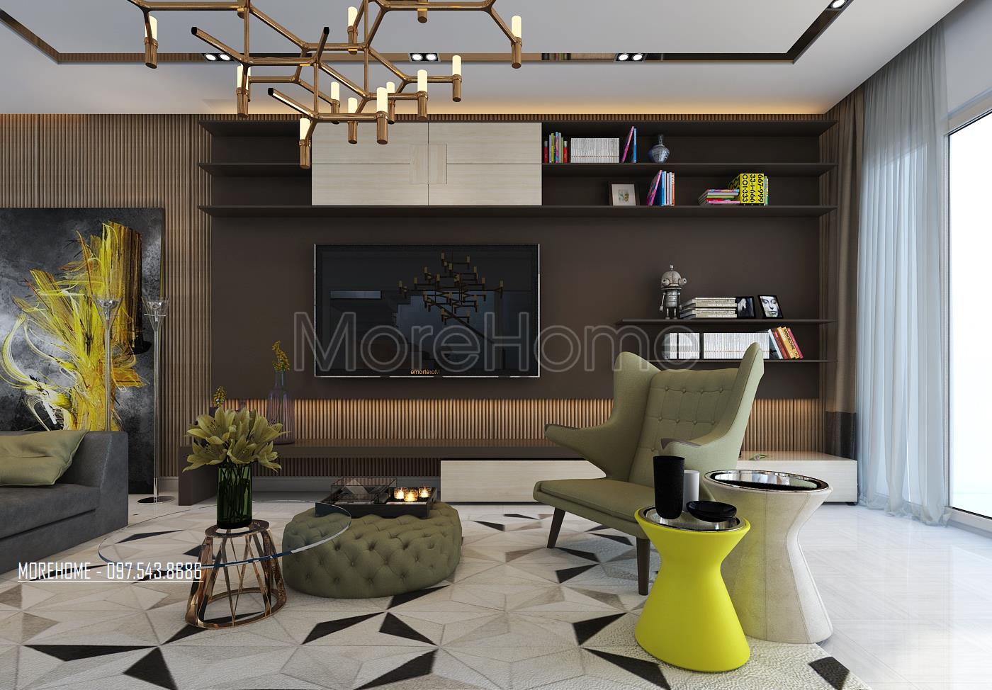 Thiết kế nội thất phòng khách sử dụng ánh sáng tự nhiên đem lại sức sống cho căn phòng. Thiết kế sofa to rộng kéo mang lại cảm giác an toàn và thoải mái cho không gian sống. Không gian phòng khách linh hoạt, thoáng và tạo khoảng gian đa năng cho các hoạt động của gia đình. Thiết kế nội thất mảng tường khác biệt được kiến trúc sư áp dụng mang đến sự khác biệt và thu hút hơn cho căn phòng. Bức tường thô đơn sắc với các vân gỗ nhẹ kéo dài từ trên xuống dưới tạo cảm giác tăng thêm chiều cao cho căn phòng. Tone màu nâu sữa nhẹ nhàng giúp mang đến cảm giác dễ chịu và hài hòa với tone trắng chủ đạo.