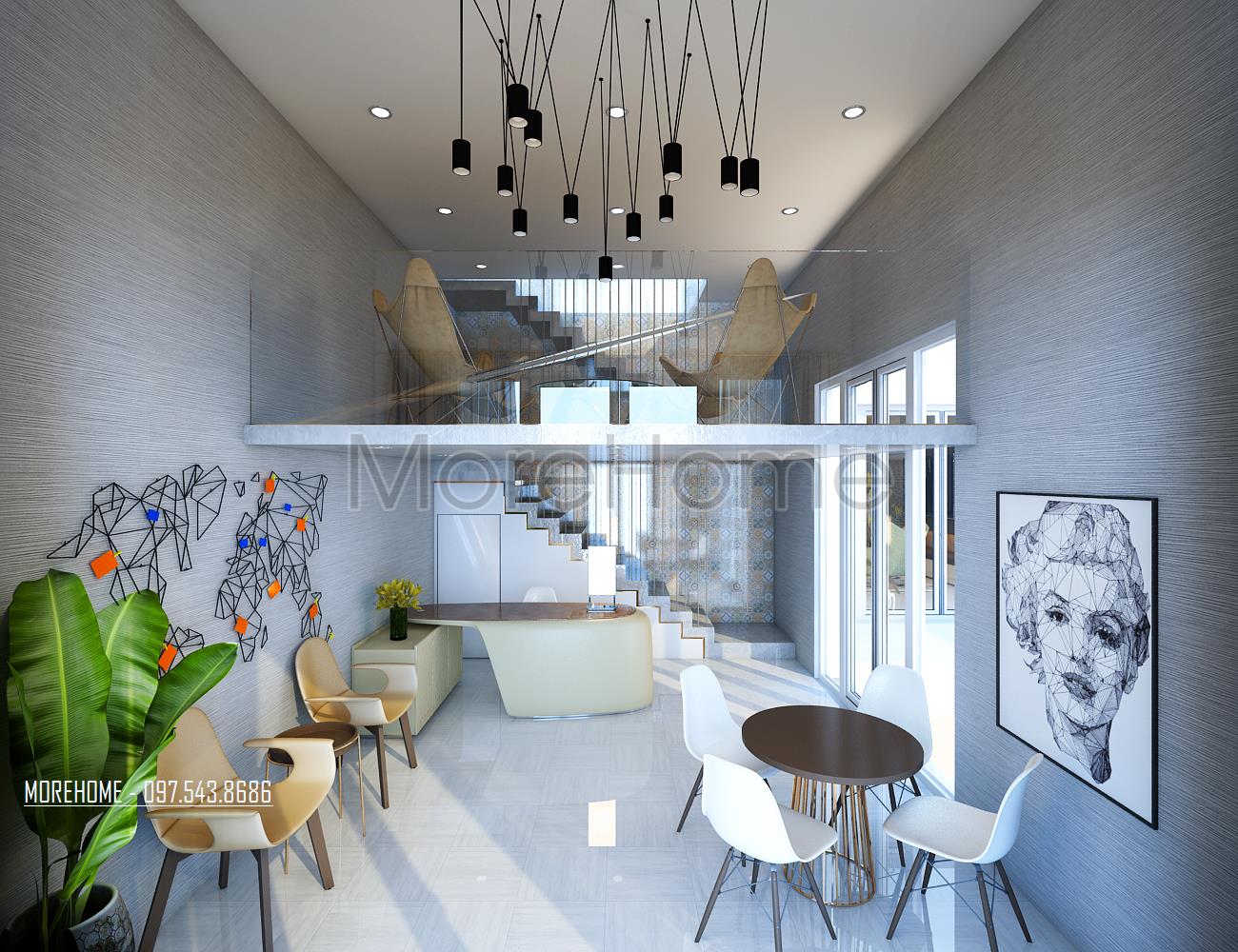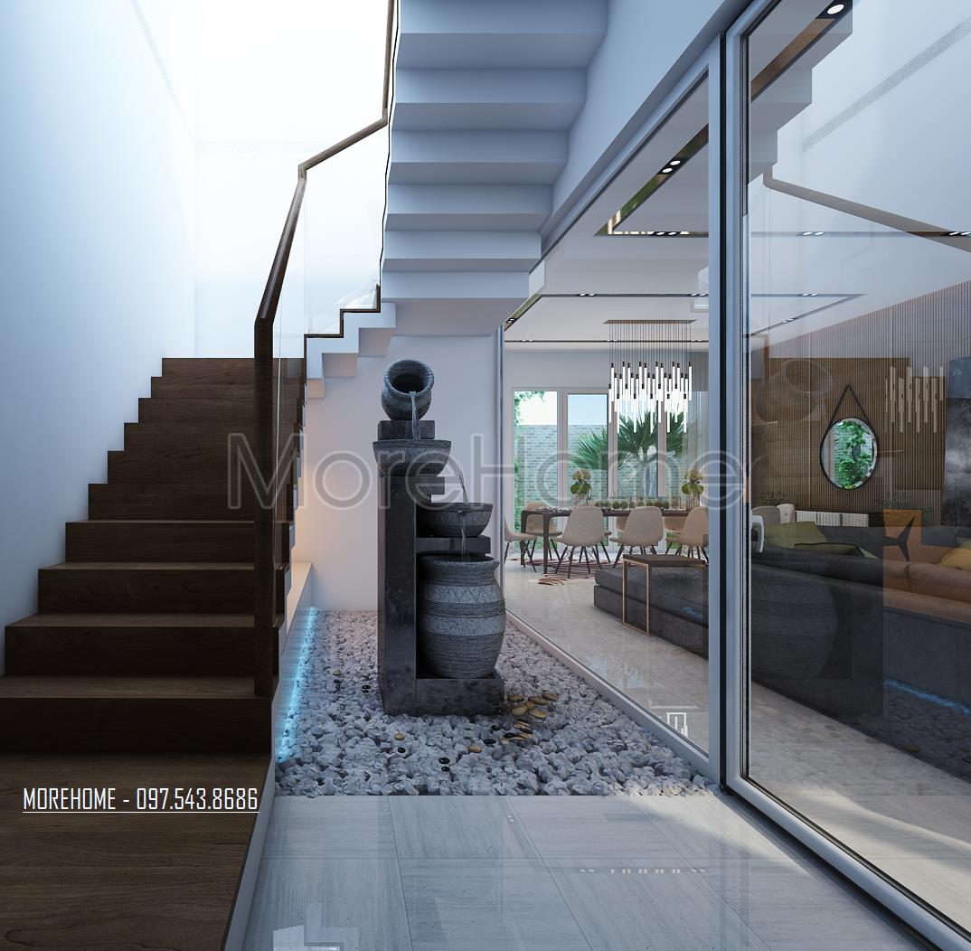 Không gian thiết kế phân cắt giữa lối lên tầng 1 và tầng 2 sử dụng kính cường lực làm vật liệu tạo khoảng mở và trong suốt cho không gian. Chính lối thiết kế độc đáo này giúp tạo độ cơi nới cho không gian hẹp.