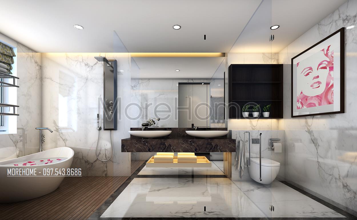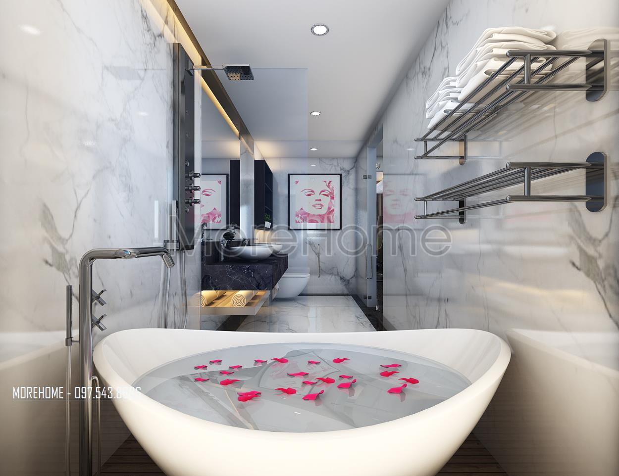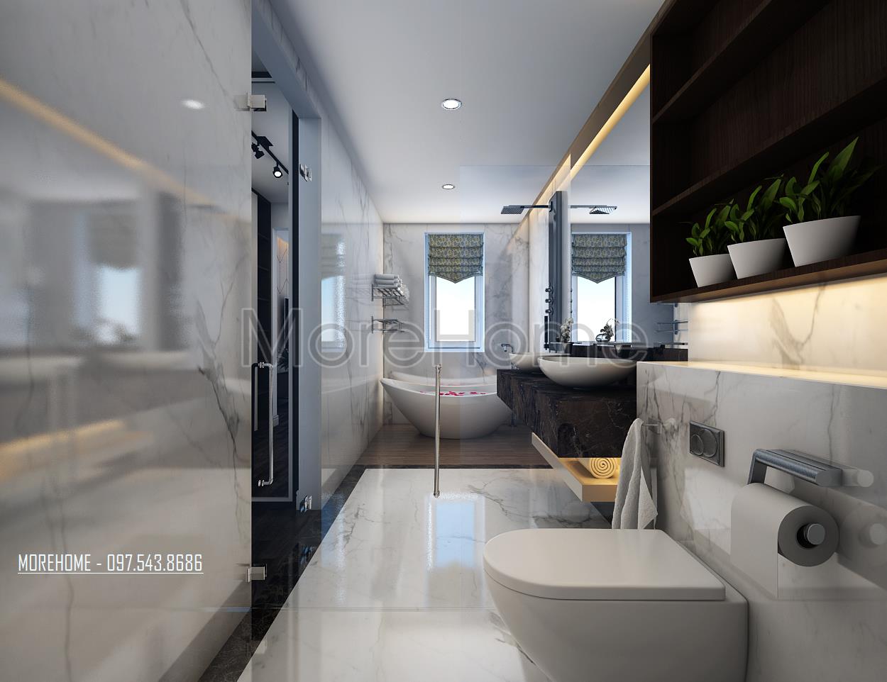 Cuối cùng là thiết kế nội thất phòng tắm hiện đại với kính và đá tự nhiên là vật liệu chủ yếu giúp tăng độ mở nhờ vào sự phản chiếu nhẹ nhàng của không gian.