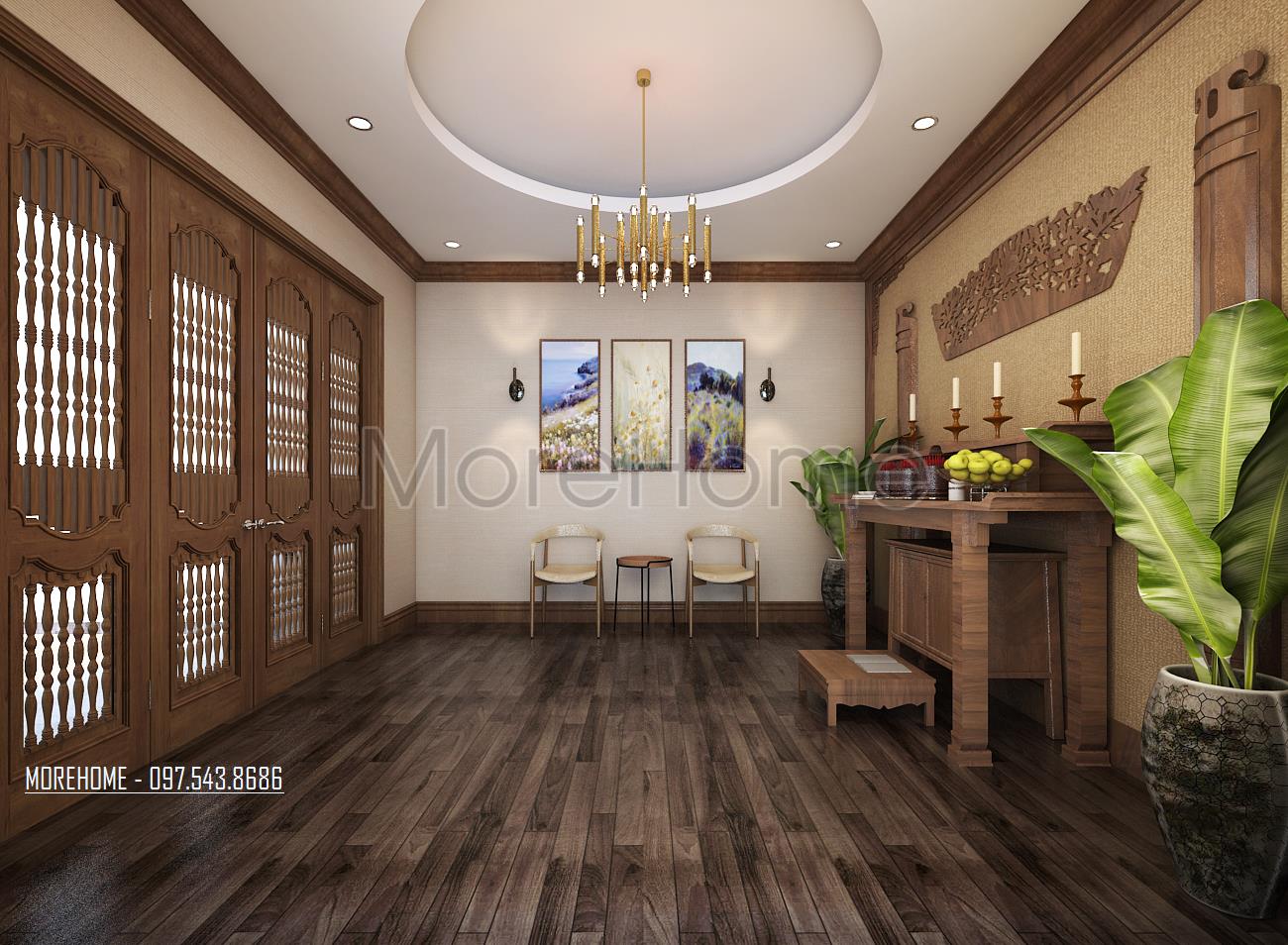 Một khu vực phòng riêng rộng rãi được sử dụng làm không gian linh thiêng thờ cúng. Thiết kế gỗ tự nhiên được ưu ái hơn cả sử dụng gỗ tự nhiên làm vật liệu chính mang đến sự thoải mái và yên bình cho không gian thờ cúng. Bên cạnh đó, các yếu tố phong thủy tâm linh cũng được tuân theo mang lại sự bình tâm trong gia chủ. Không gian xanh thiết kế đối xứng là một cách khéo léo điểm sắc tạo sự cân bằng cho căn phòng.