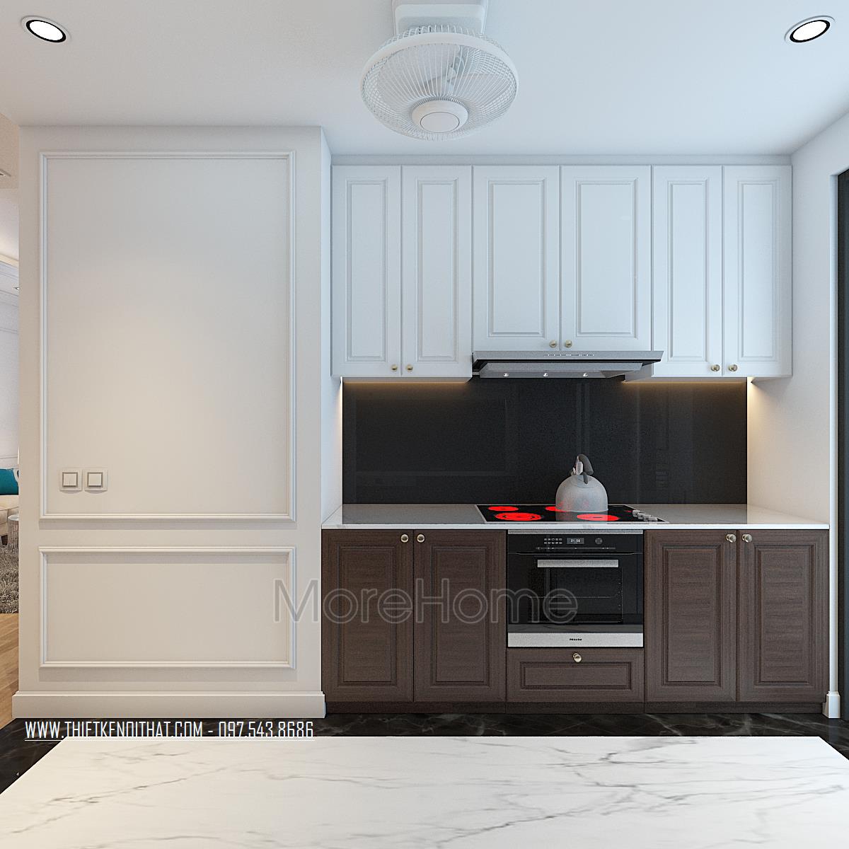 Căn bếp liền kề được thiết kế gọn gàng với tone màu đơn giản đảm bảo tính công năng, gọn gàng và tinh tế.