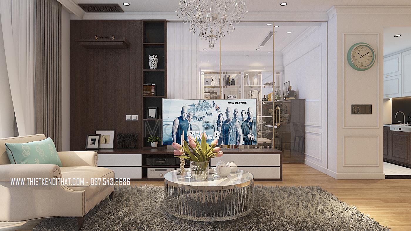 Thiết kế nội thất phòng khách hiện đại sử dụng tone màu be nhạt và trắng làm nền mang đến cho căn phòng cảm giác nhẹ nhàng và tươi mới. Thiết kế ghế sofa to rộng, chất liệu giả da êm ái giúp tạo sự thoải mái cho gia chủ. Thiết kế kệ tủ là một trong những điều khá đau đầu với nhiều gia chủ, làm sao để vừa đảm bảo tính thẩm mỹ, lại vừa đúng tỉ lệ và phù hợp với căn hộ, để giải quyết vấn đề này, kiến trúc sư đã khéo léo sử dụng các tủ gỗ đóng riêng cho căn hộ giúp mang đến sự ưng ý nhất cho gia chủ. Không quá nhấn mạnh vào chi tiết tuy nhiên tủ gỗ kết hợp kệ ti vi này lại vô cùng chú trọng đến tính công năng, vừa đảm bảo mang lại không gian sống gọn gàng lại góp phần tiết kiệm diện tích.