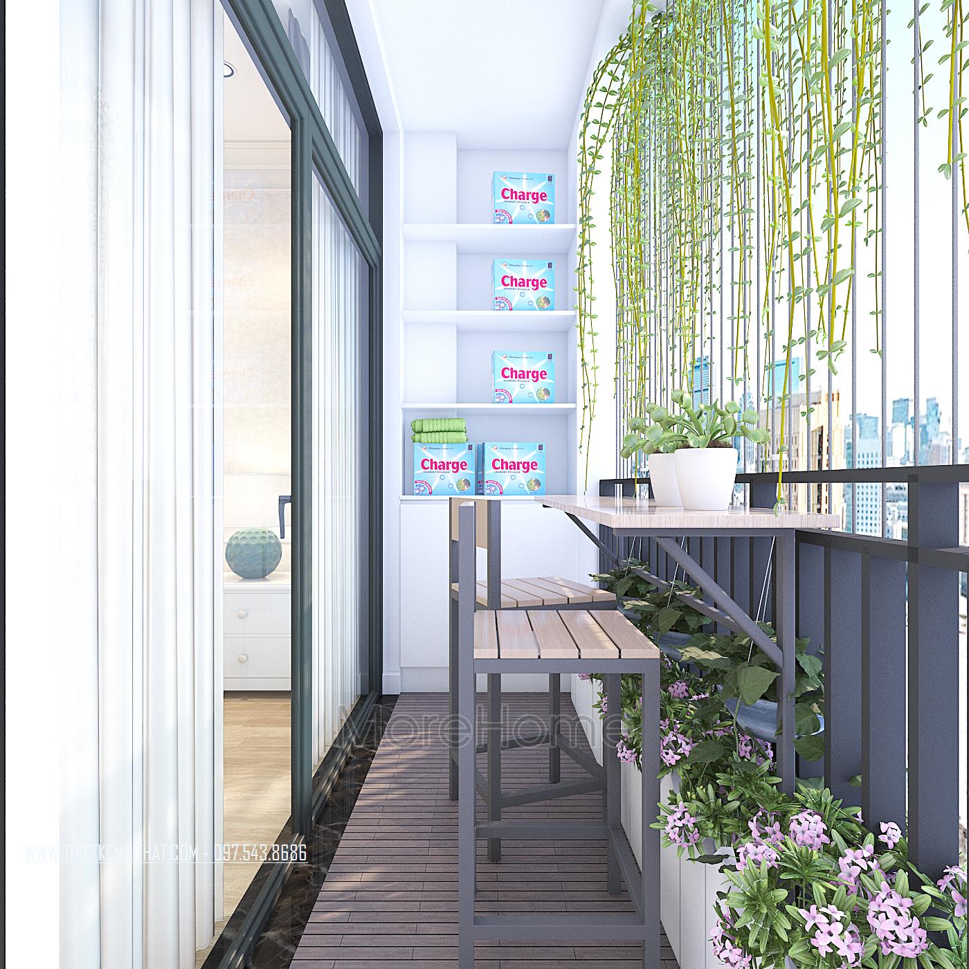 Một trong những không gian được ưa thích của căn hộ chính là thiết kế ban công xanh mát. Thiết kế vườn treo độc đáo với kế ngồi hướng tầm mắt ra khung cảnh toàn thành phố, đây thực sự là không gian thư giãn tuyệt với sau một ngày dài mệt nhọc. Bên cạnh đó, thiết kế thanh ngang gọn gàng làm kệ đồ còn tăng thêm tính công năng cho không gian sống.