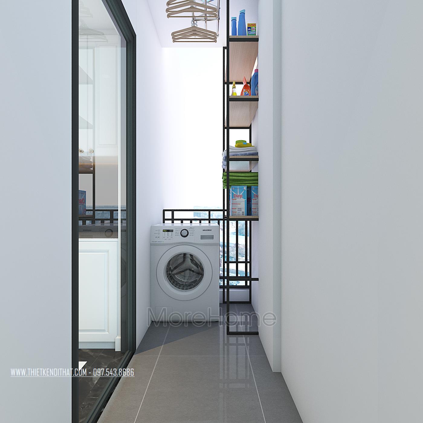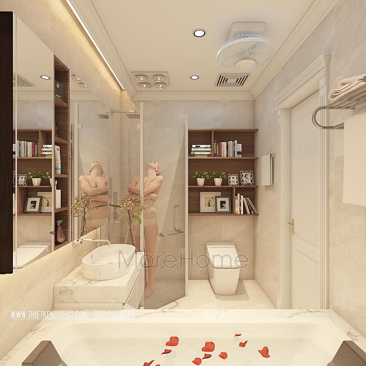 Cuối cùng là thiết kế nhà vệ sinh hiện đại. Tone màu trắng sáng được sử dụng giúp không gian trở nên sáng hơn, tạo hiệu ứng mở rộng không gian. Các thiết bị sử dụng được thiết kế đơn giản, chất liệu nhẹ như kính cường lực, gương, đá tự nhiên được sử dụng mang đến sự linh hoạt, góp phần tăng độ thoáng và mở cho căn phòng.