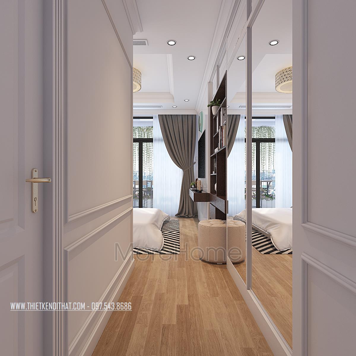 Thiết kế nội thất phòng ngủ đơn giản với sự phối hợp hài hòa của màu sắc, chi tiết, đường nét và cả màu sắc. Không gian nhỏ trở nên rất đa năng và tiện dụng nhờ vào các thiết kế kết hợp kệ tủ, vừa đảm bảo tính công năng lại giúp tiết kiệm diện tích. Ngoài ra, thiết kế mở nhờ vào ứng dụng kính cường lực trong suốt giúp mang lại ánh sáng tự nhiên, tăng độ mở và độ thoáng cho không gian hẹp.