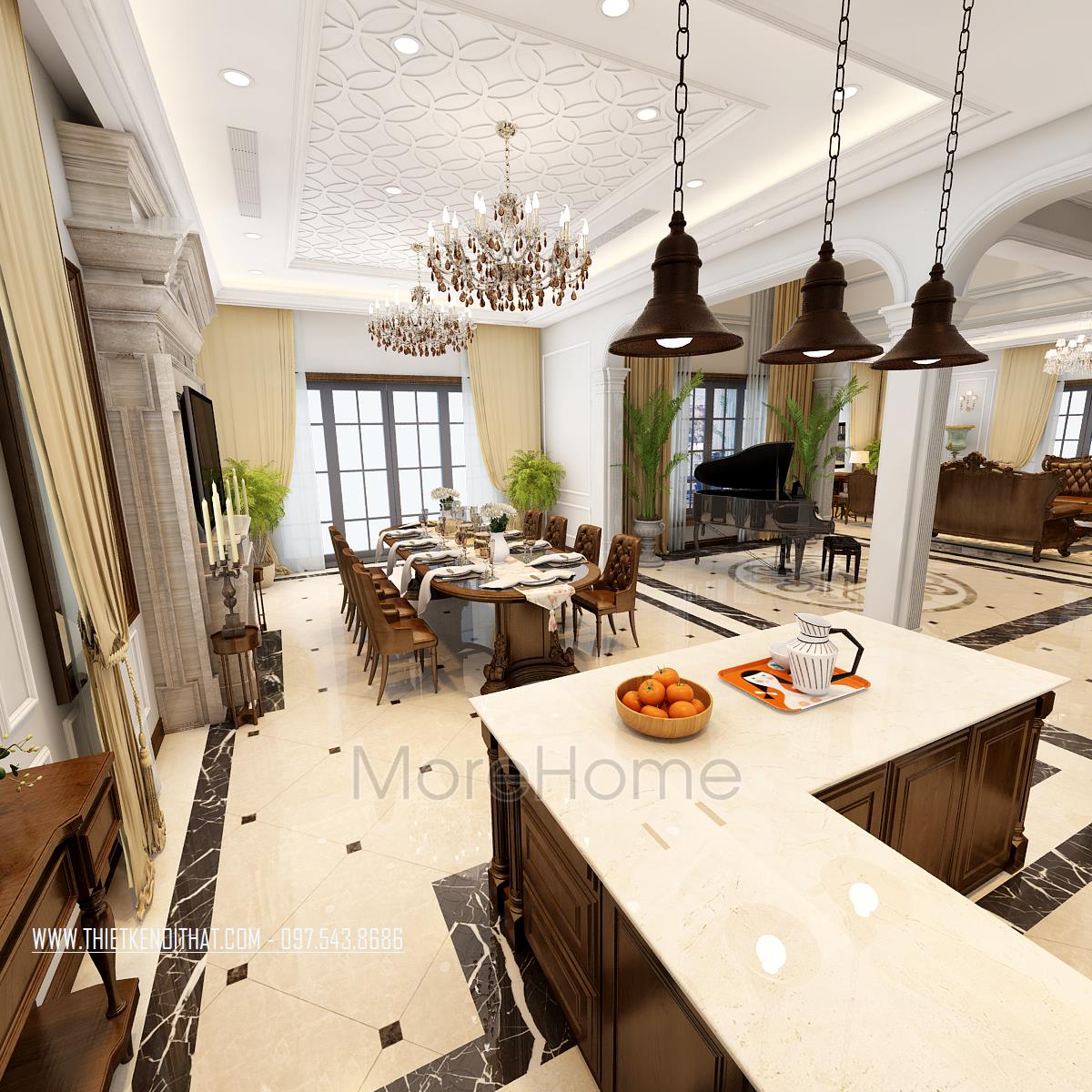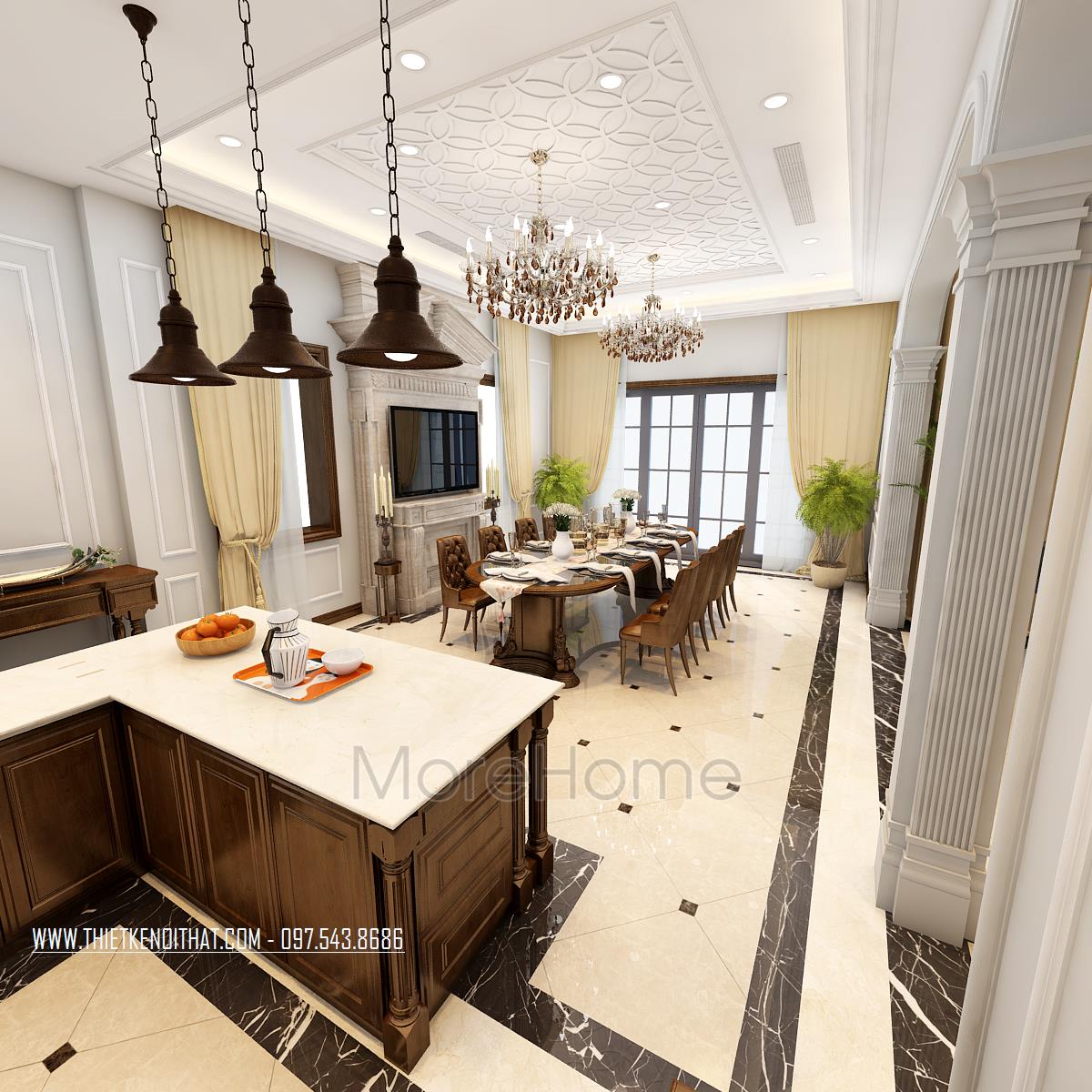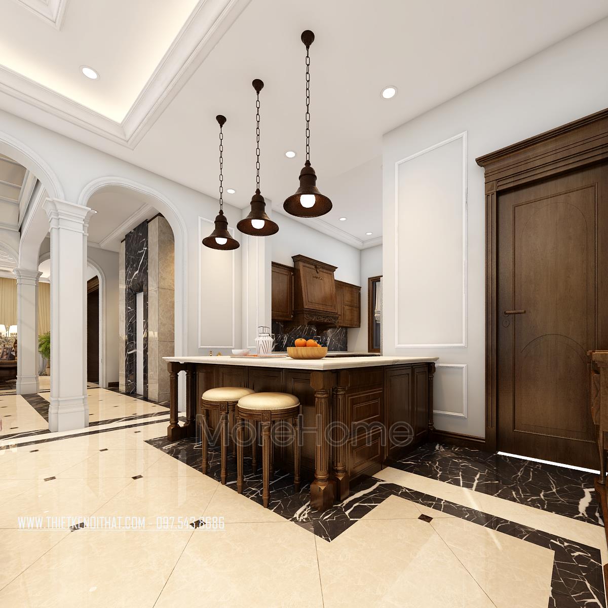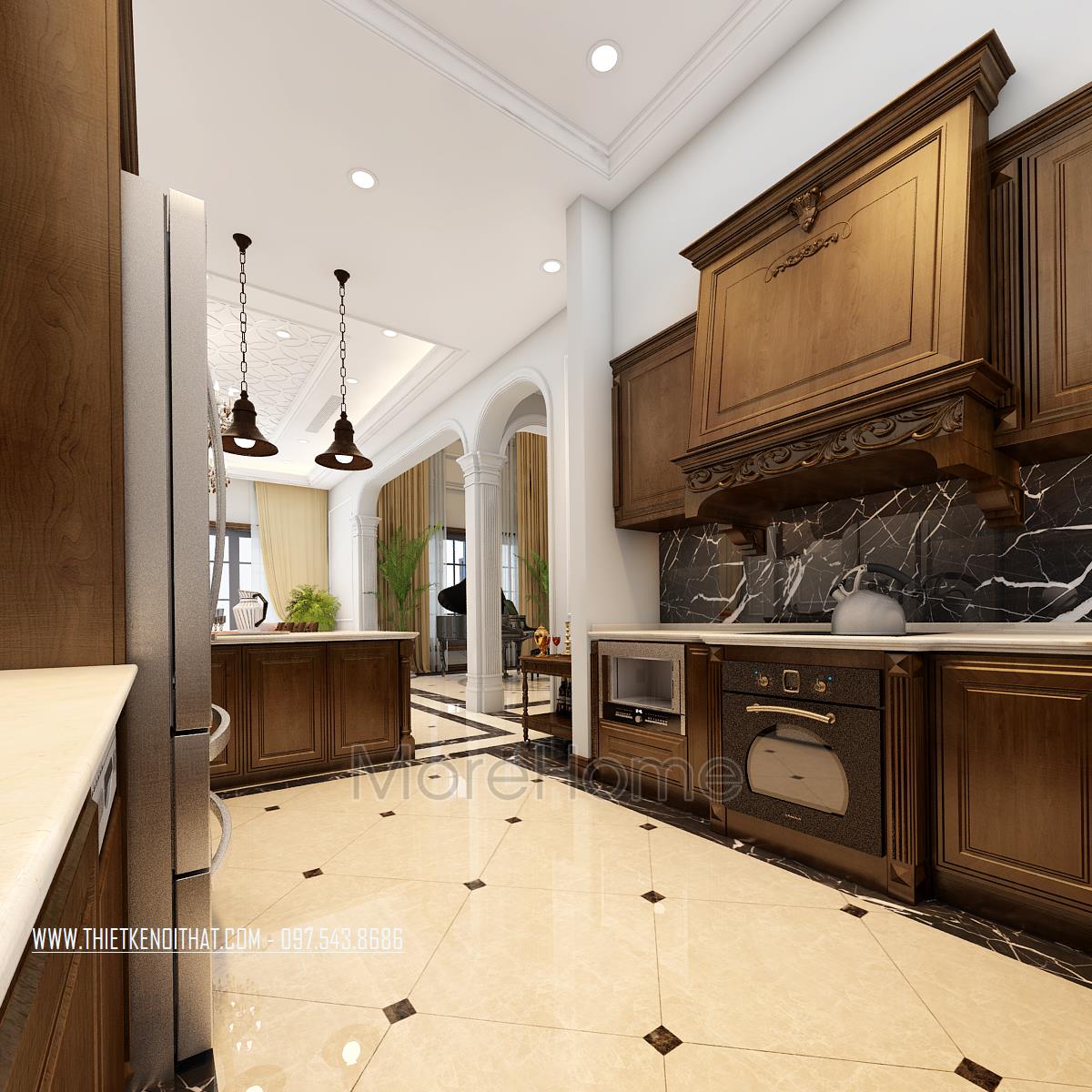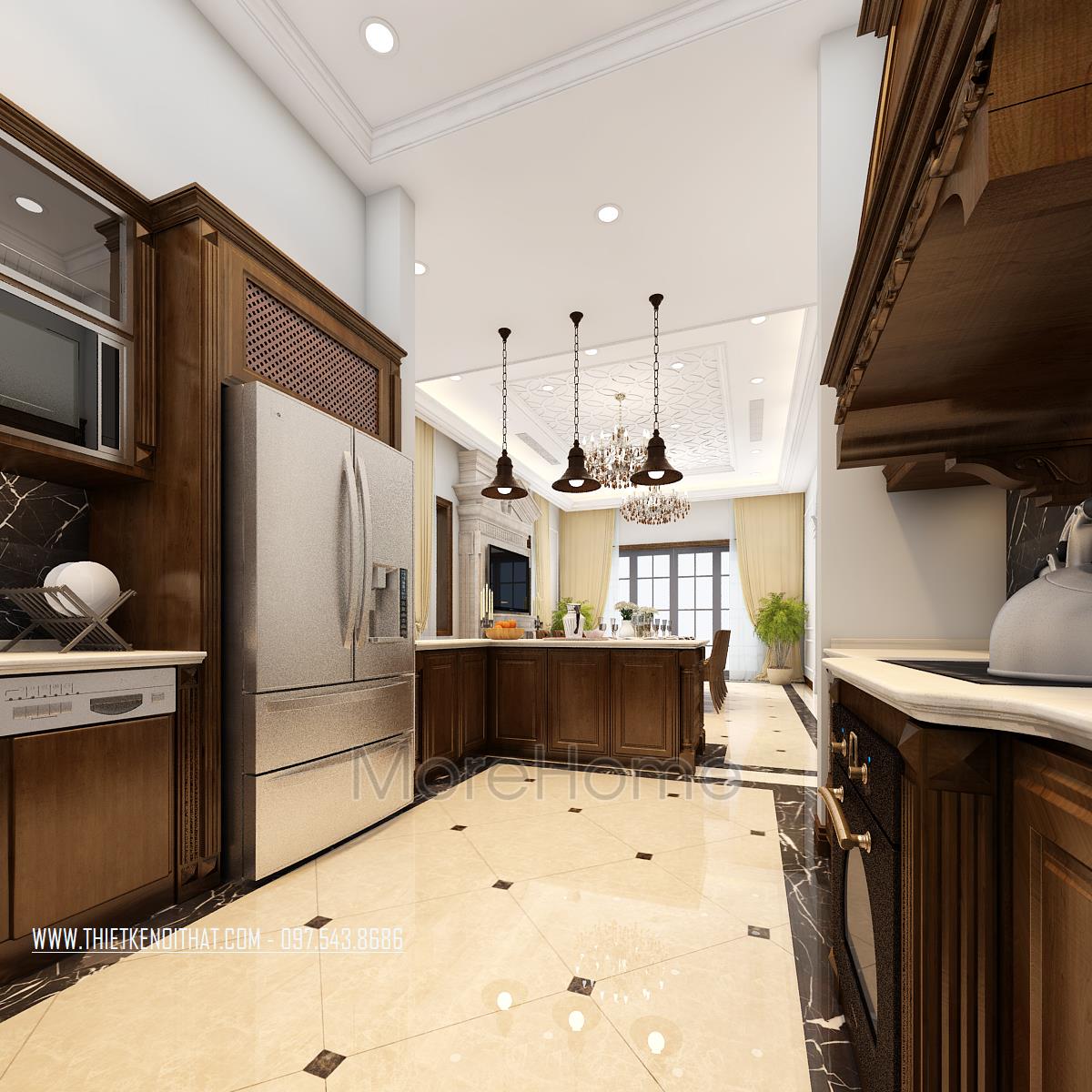 Tiếp theo là thiết kế nội thất bếp và phòng ăn tân cổ điển, tone màu nâu trầm ấm áp và gần gũi vẫn là màu sắc được kiến trúc sư ưu ái lựa chọn mang đến sự đồng nhất và góp phần lớn thể hiện tính nhất quán trong thiết kế.
