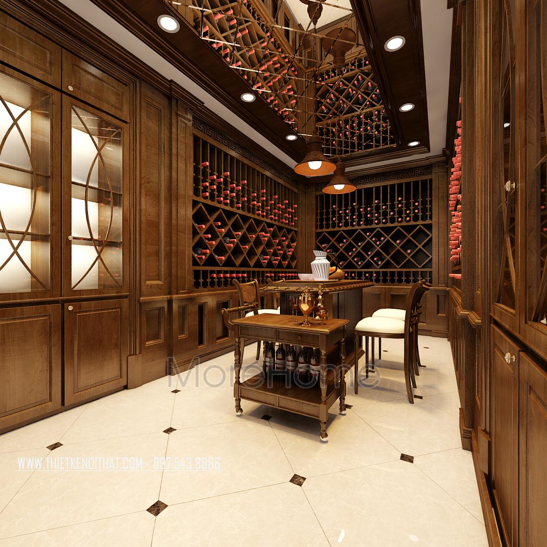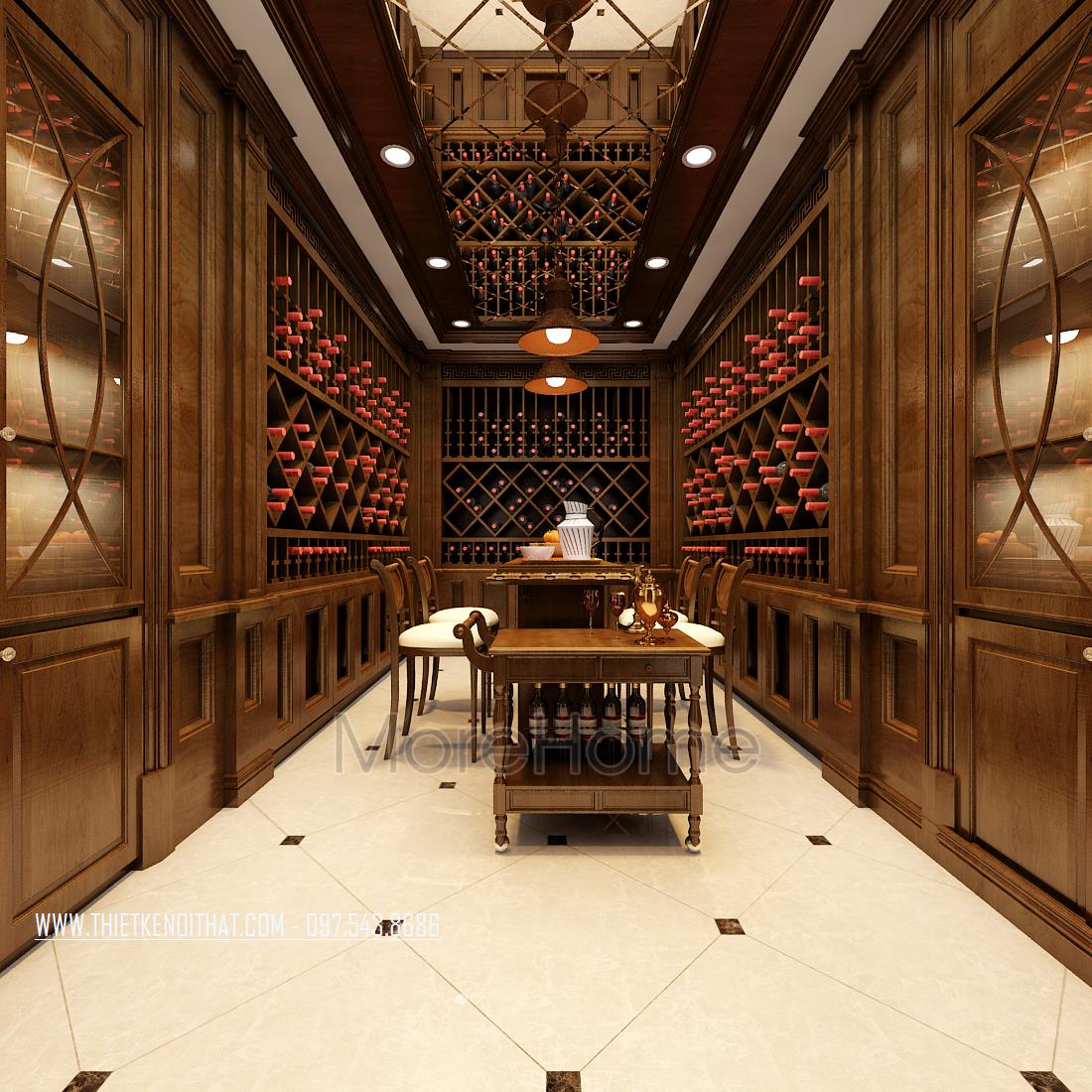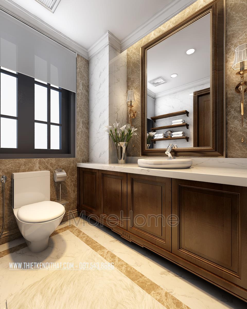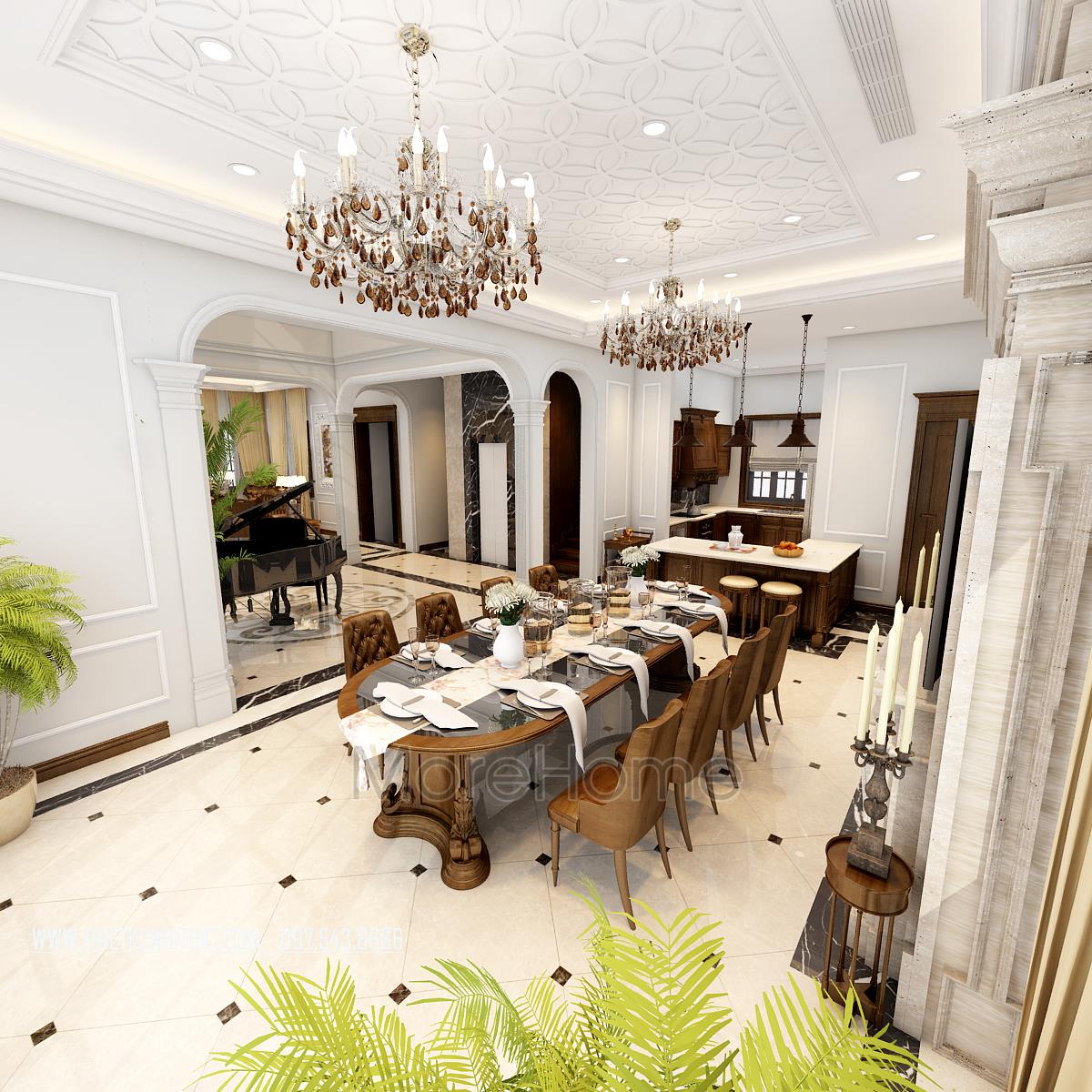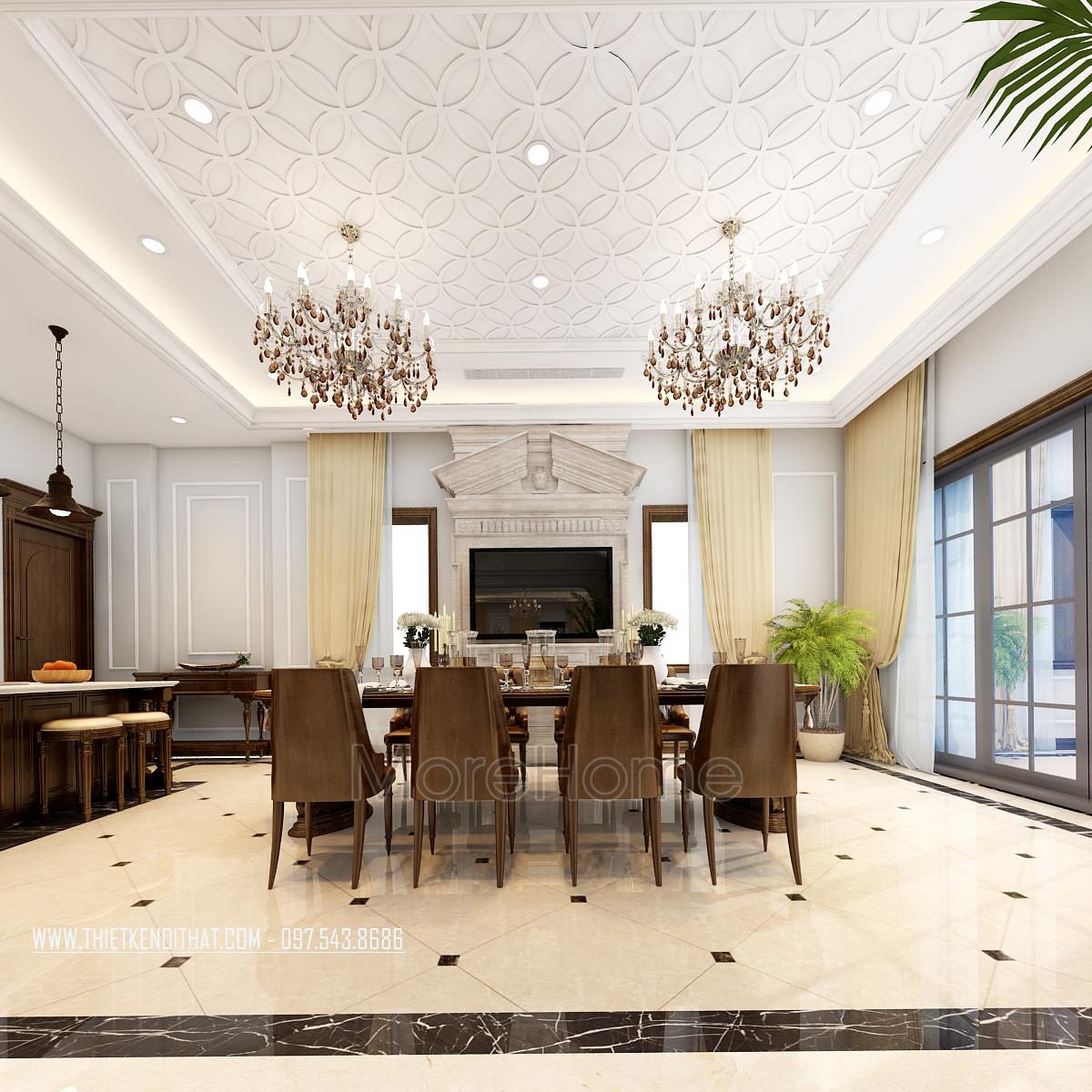 Tiếp theo là thiết kế nội thất bếp và phòng ăn tân cổ điển, tone màu nâu trầm ấm áp và gần gũi vẫn là màu sắc được kiến trúc sư ưu ái lựa chọn mang đến sự đồng nhất và góp phần lớn thể hiện tính nhất quán trong thiết kế.