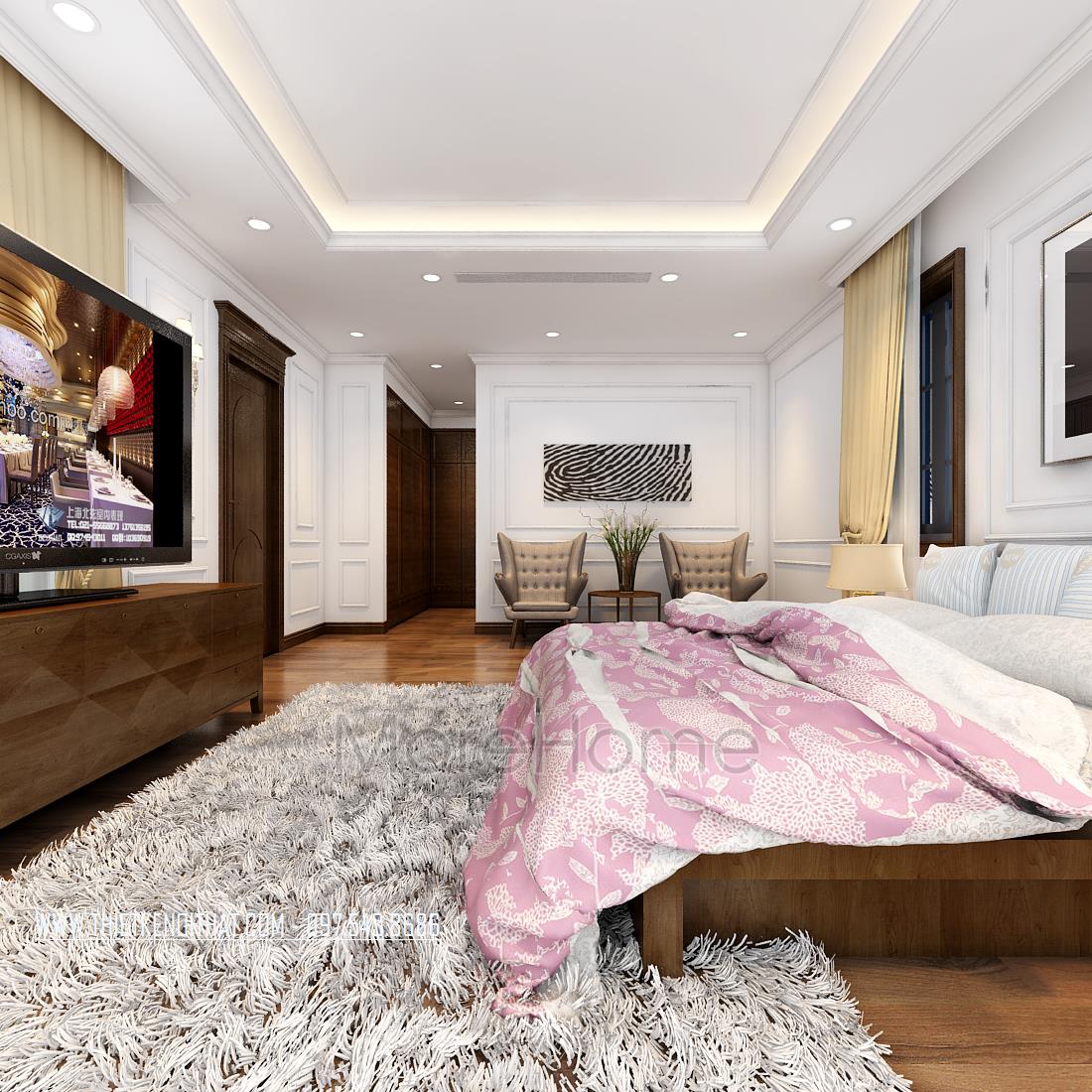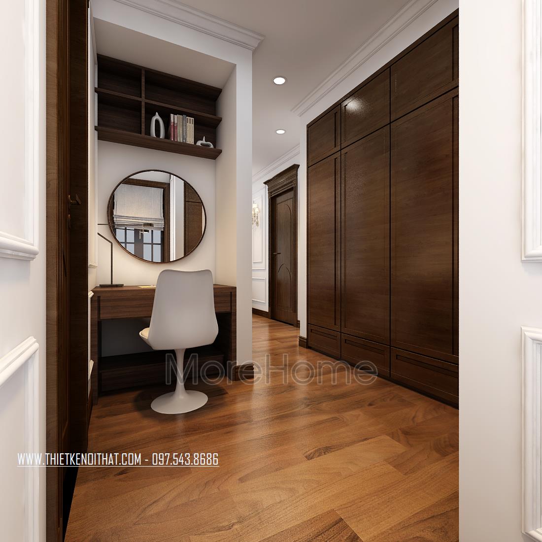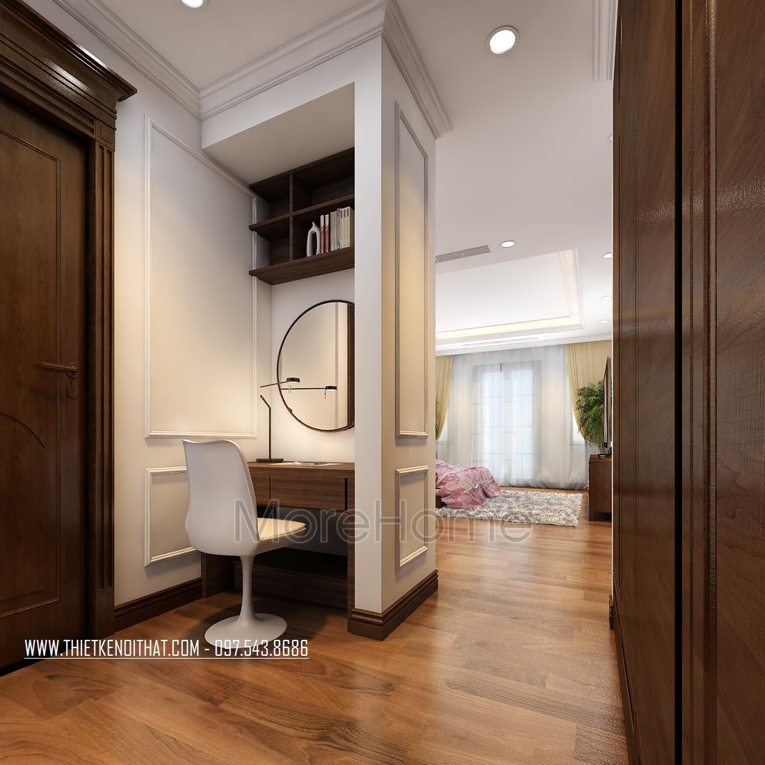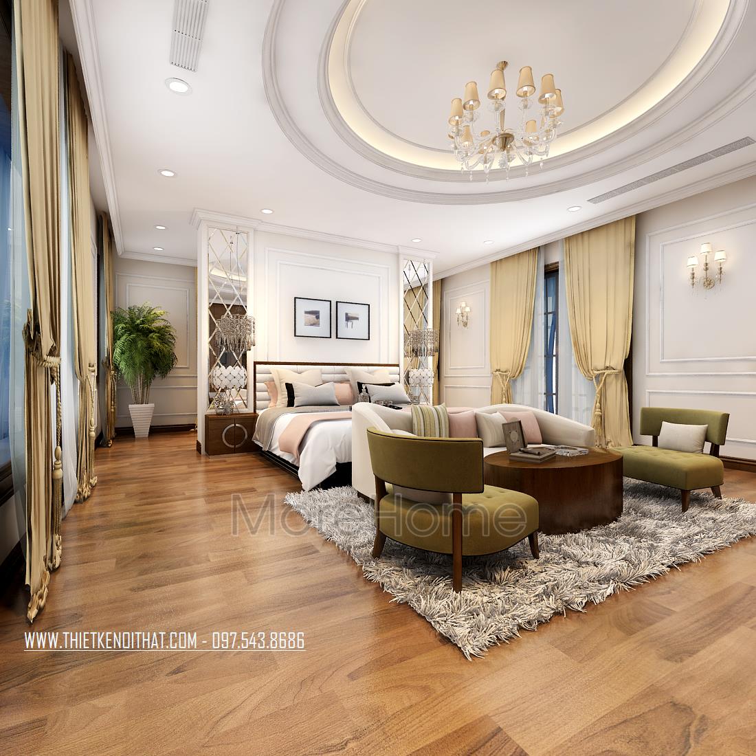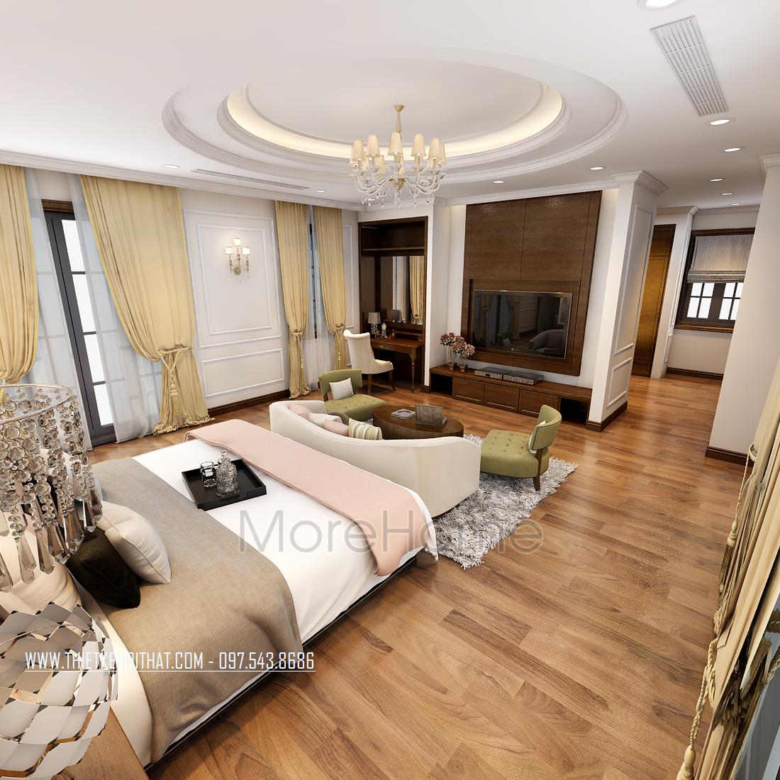 Tiếp theo là thiết kế nội thất phòng ngủ Master phong cách tân cổ điển. Điều dễ nhận thấy ở đây là thiết kế tích hợp nhiều không gian, từ nơi tiếp khách, không gian làm việc đến tủ quần áo và không giant hay đồ. Các khu vực không hề bị chia cắt bởi tường thô cứng nhắc mà thay vào đó là các thiết kế vách ngăn hoa văn tinh xảo, nhẹ nhàng vừa đảm bảo tính thẩm mỹ cho căn phòng mà vẫn giúp tiết kiệm diện tích sử dụng. Thiết kế đối xứng với tone màu nhẹ nhàng như xanh rêu, be, ghi sáng là các tone màu được kiến trúc sư lựa chọn cho căn phòng.