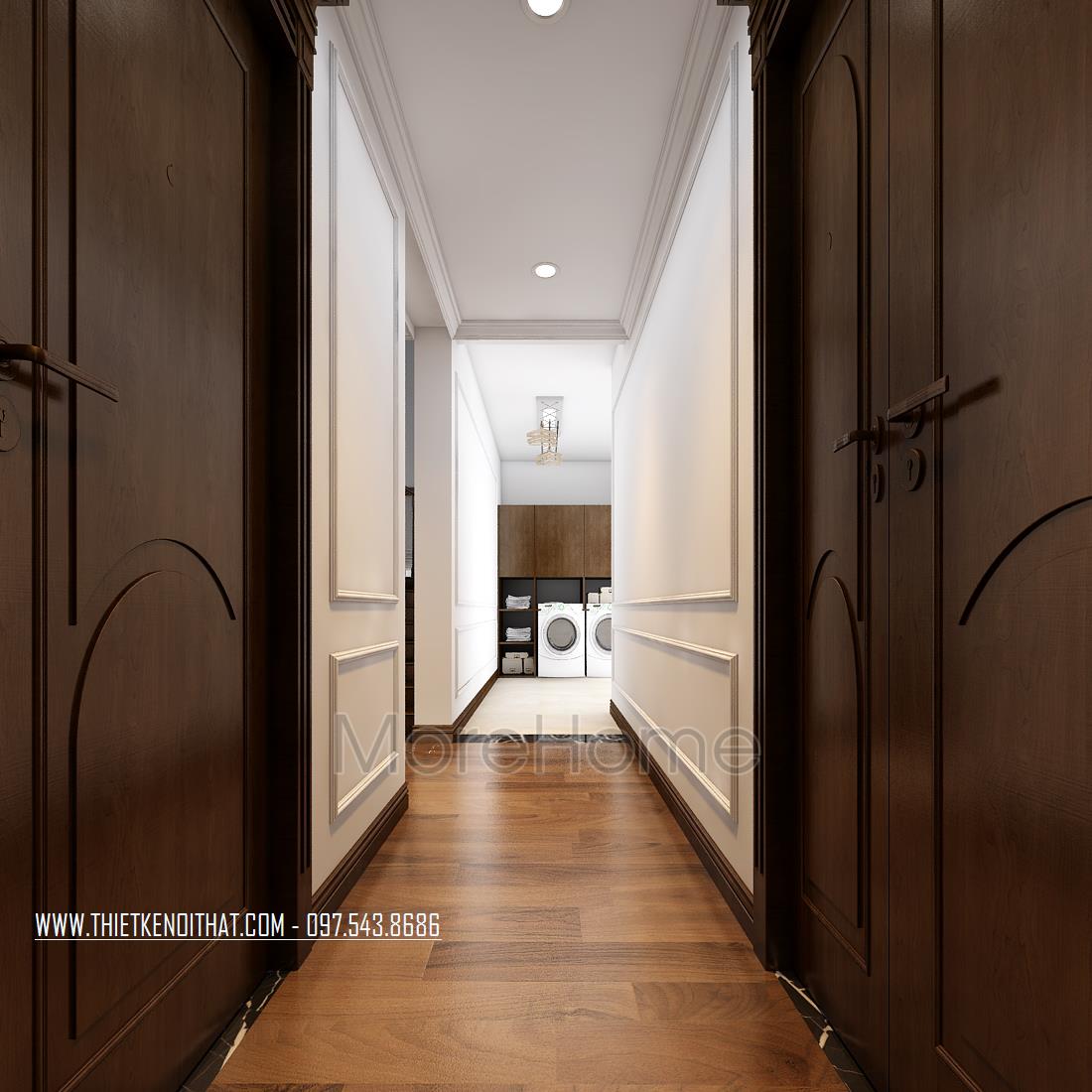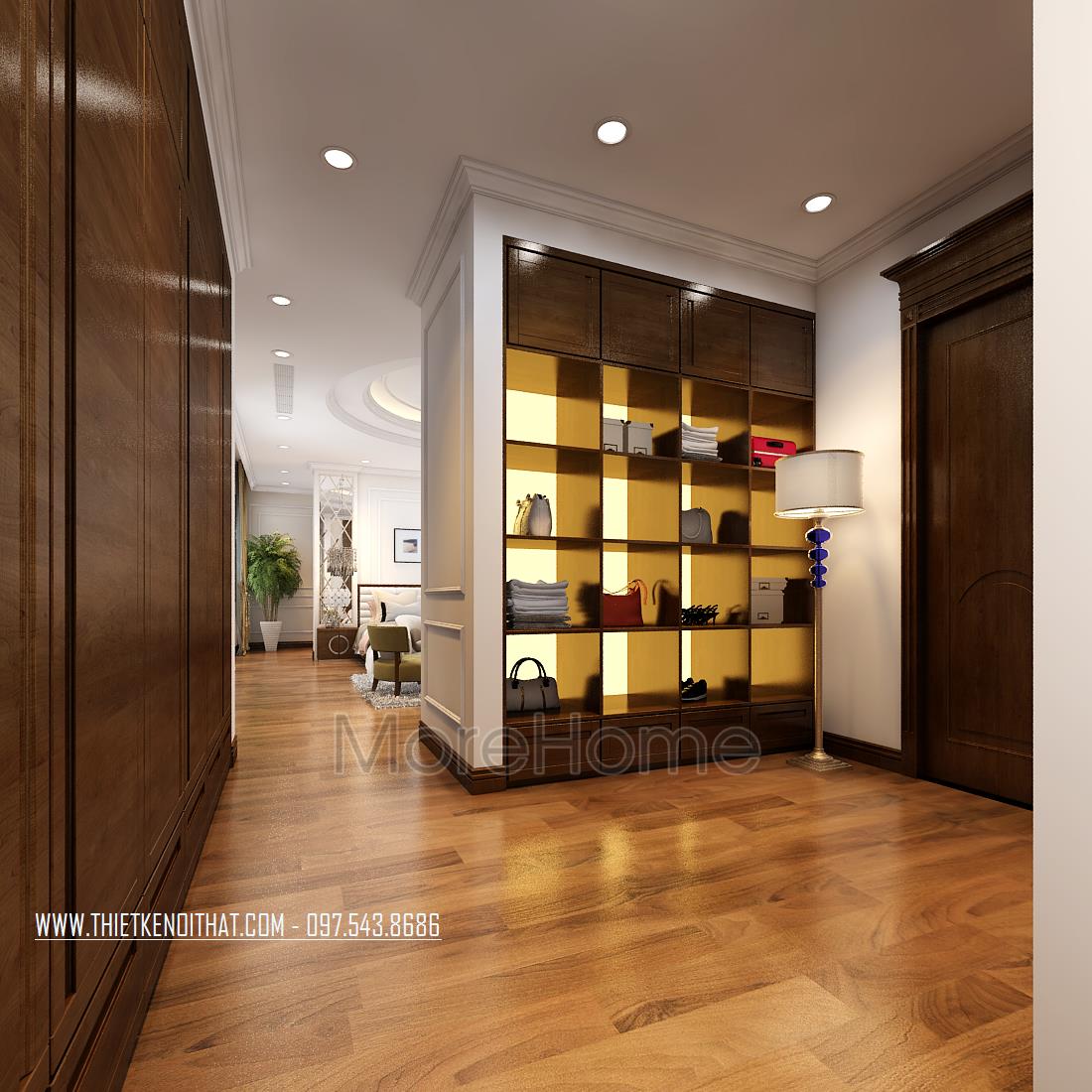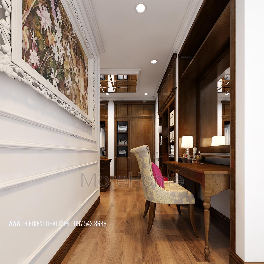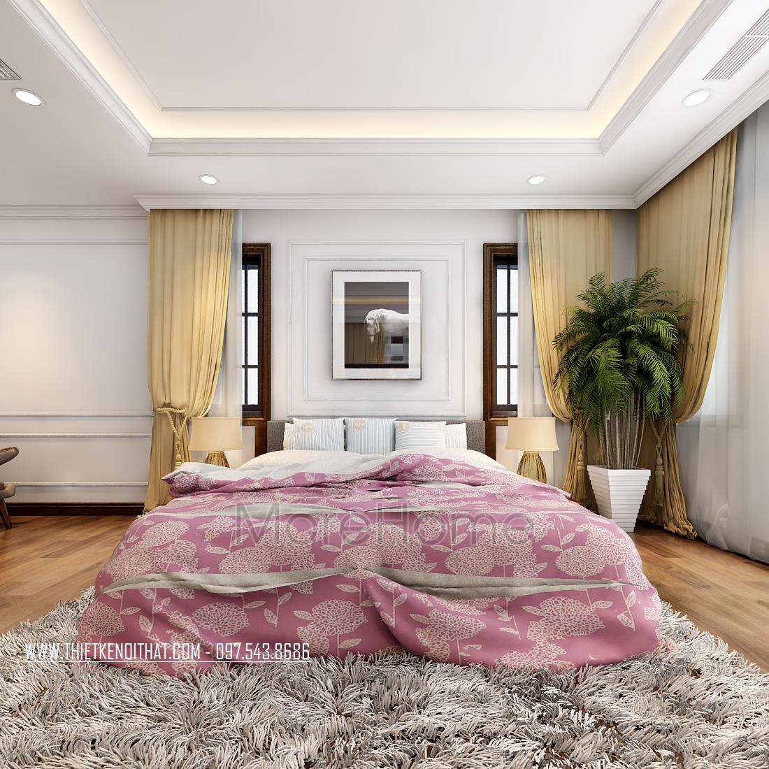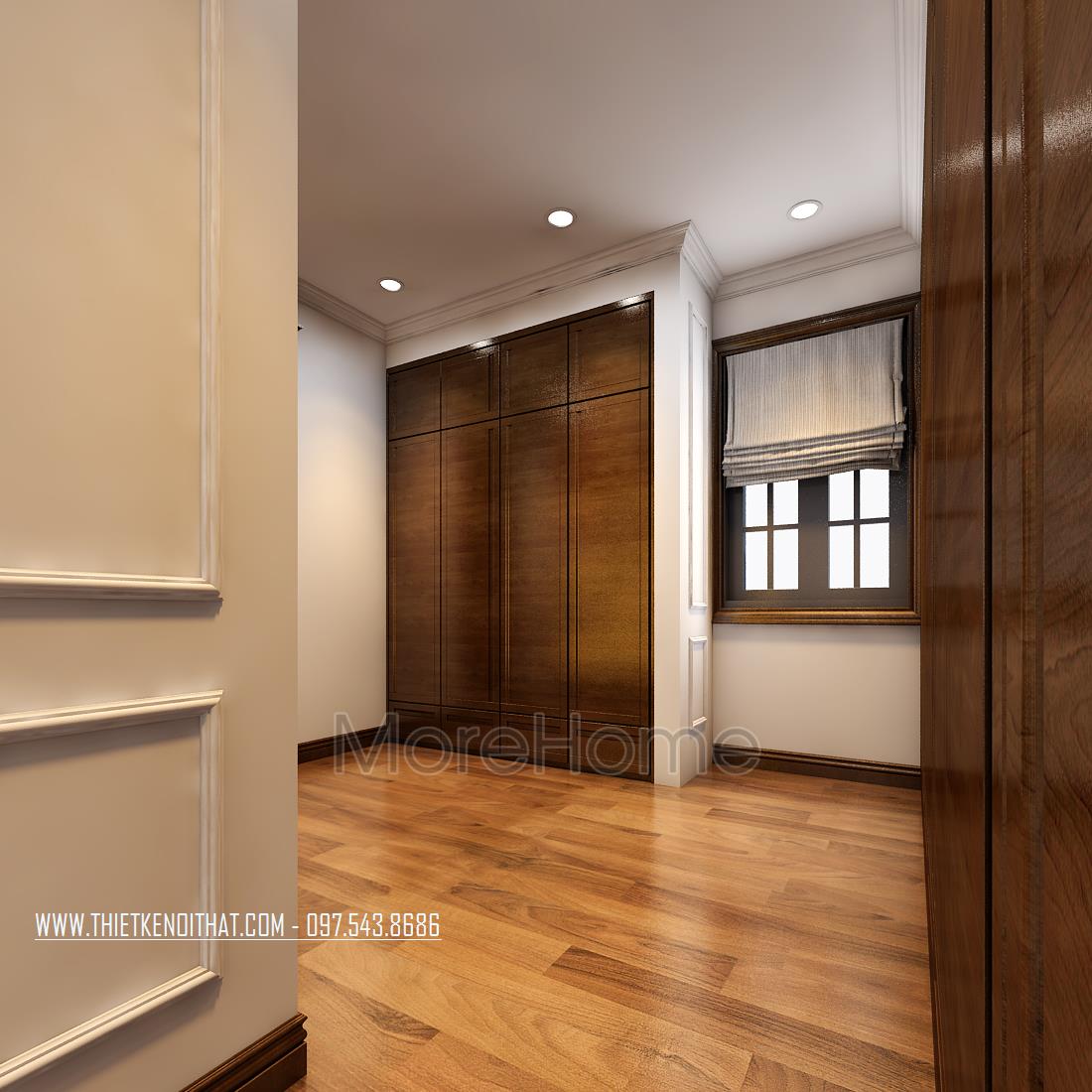 Tiếp theo là thiết kế nội thất phòng ngủ Master phong cách tân cổ điển. Điều dễ nhận thấy ở đây là thiết kế tích hợp nhiều không gian, từ nơi tiếp khách, không gian làm việc đến tủ quần áo và không giant hay đồ. Các khu vực không hề bị chia cắt bởi tường thô cứng nhắc mà thay vào đó là các thiết kế vách ngăn hoa văn tinh xảo, nhẹ nhàng vừa đảm bảo tính thẩm mỹ cho căn phòng mà vẫn giúp tiết kiệm diện tích sử dụng. Thiết kế đối xứng với tone màu nhẹ nhàng như xanh rêu, be, ghi sáng là các tone màu được kiến trúc sư lựa chọn cho căn phòng.