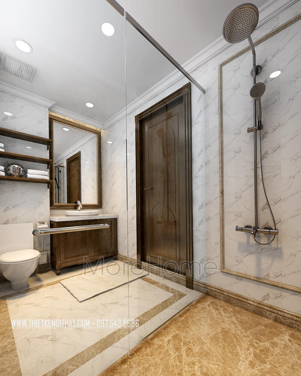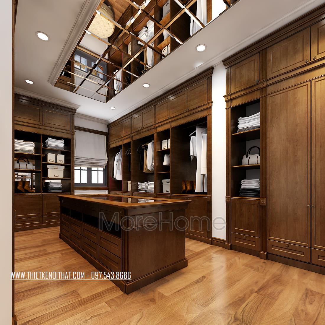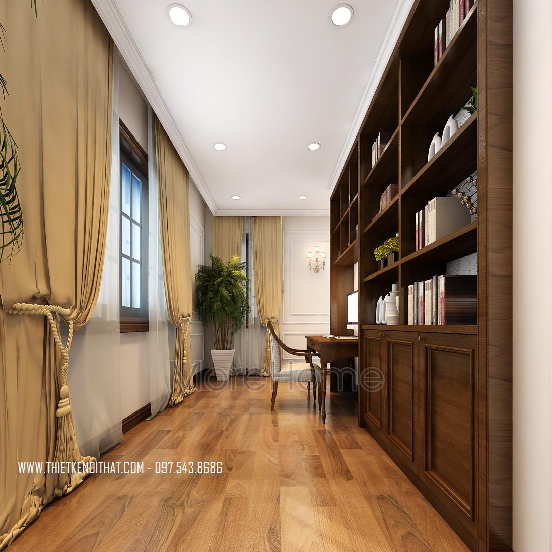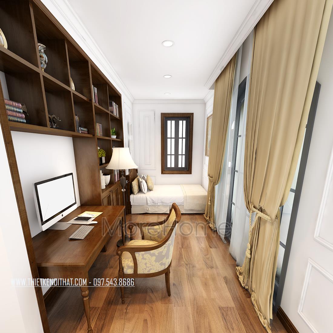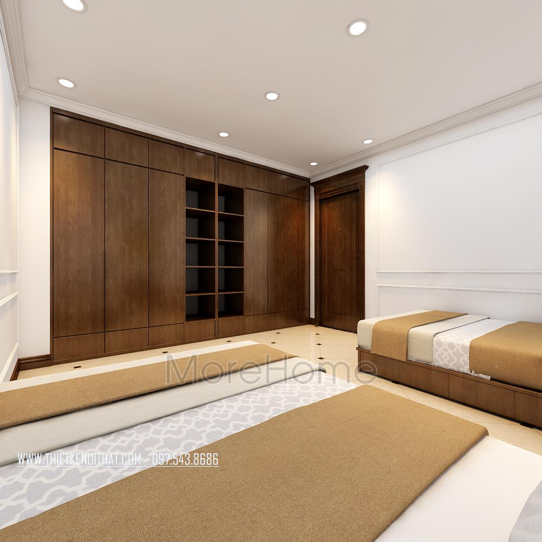 Tiếp theo là thiết kế nội thất phòng ngủ Master phong cách tân cổ điển. Điều dễ nhận thấy ở đây là thiết kế tích hợp nhiều không gian, từ nơi tiếp khách, không gian làm việc đến tủ quần áo và không giant hay đồ. Các khu vực không hề bị chia cắt bởi tường thô cứng nhắc mà thay vào đó là các thiết kế vách ngăn hoa văn tinh xảo, nhẹ nhàng vừa đảm bảo tính thẩm mỹ cho căn phòng mà vẫn giúp tiết kiệm diện tích sử dụng. Thiết kế đối xứng với tone màu nhẹ nhàng như xanh rêu, be, ghi sáng là các tone màu được kiến trúc sư lựa chọn cho căn phòng.