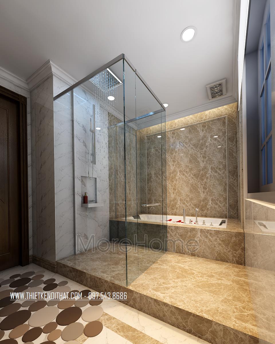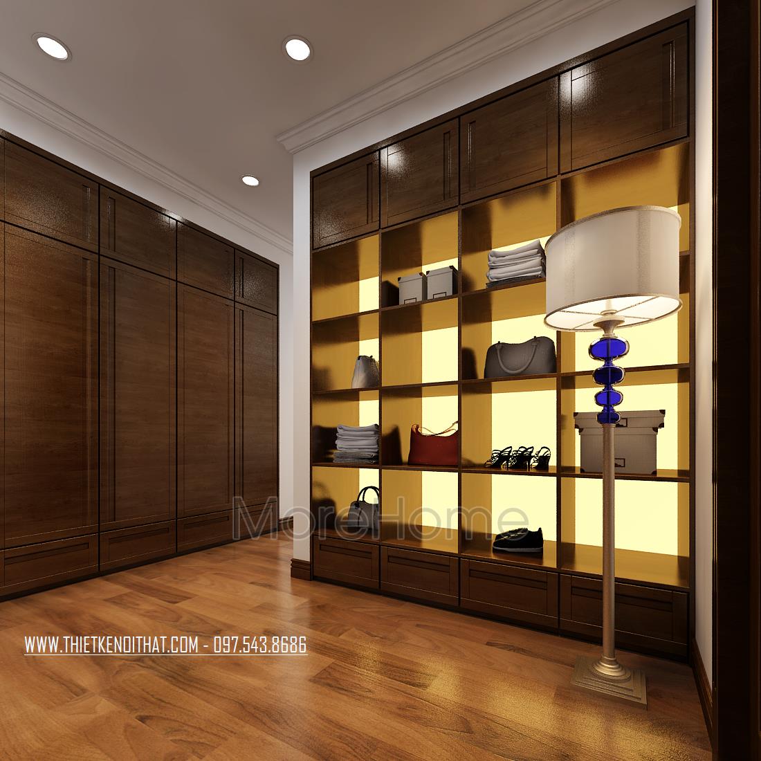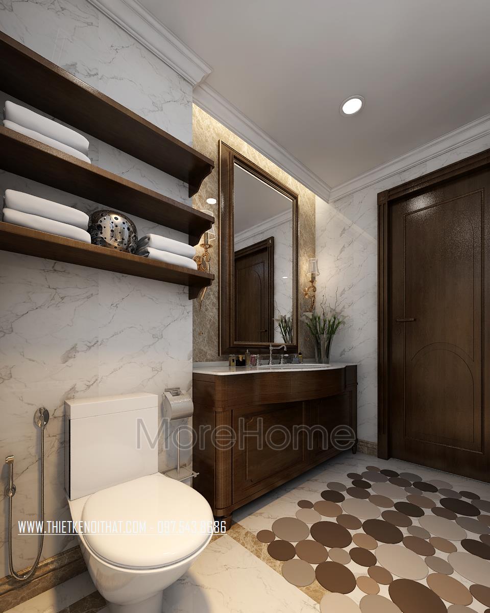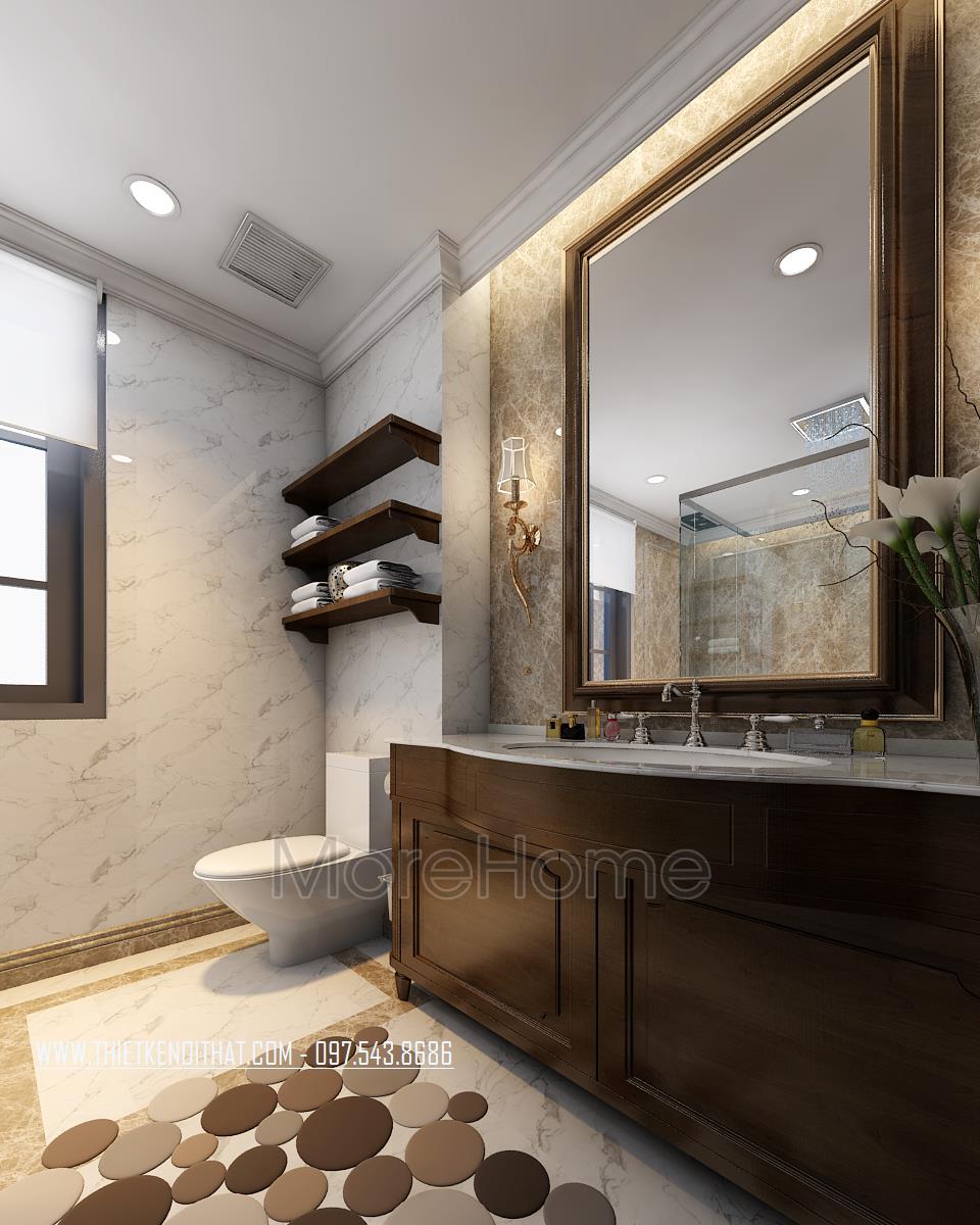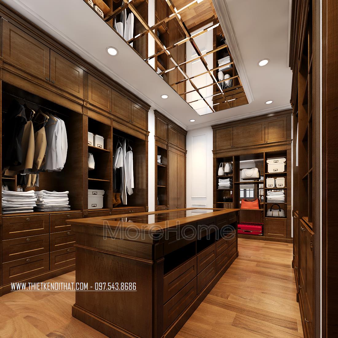 Tiếp theo là thiết kế nội thất phòng ngủ Master phong cách tân cổ điển. Điều dễ nhận thấy ở đây là thiết kế tích hợp nhiều không gian, từ nơi tiếp khách, không gian làm việc đến tủ quần áo và không giant hay đồ. Các khu vực không hề bị chia cắt bởi tường thô cứng nhắc mà thay vào đó là các thiết kế vách ngăn hoa văn tinh xảo, nhẹ nhàng vừa đảm bảo tính thẩm mỹ cho căn phòng mà vẫn giúp tiết kiệm diện tích sử dụng. Thiết kế đối xứng với tone màu nhẹ nhàng như xanh rêu, be, ghi sáng là các tone màu được kiến trúc sư lựa chọn cho căn phòng.