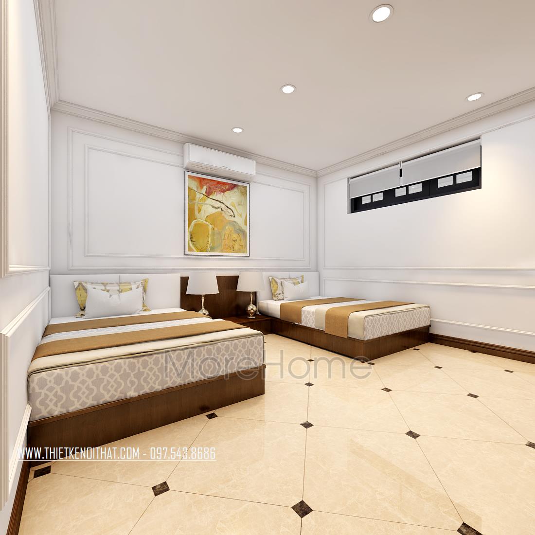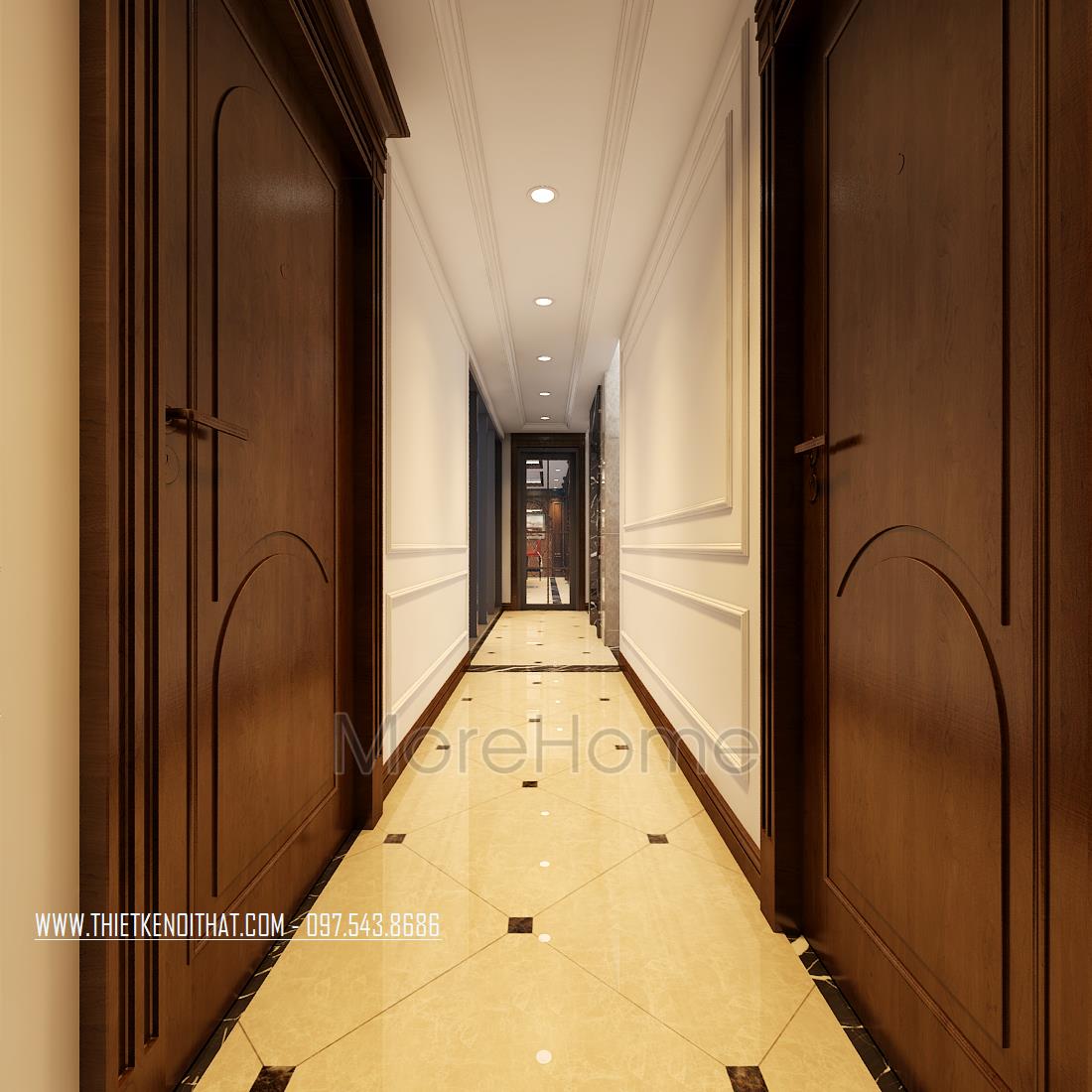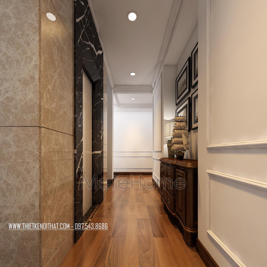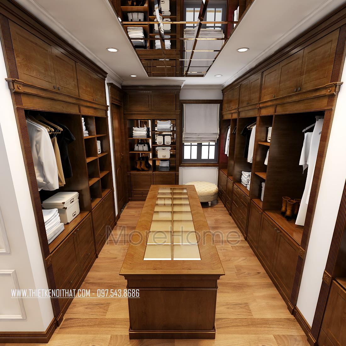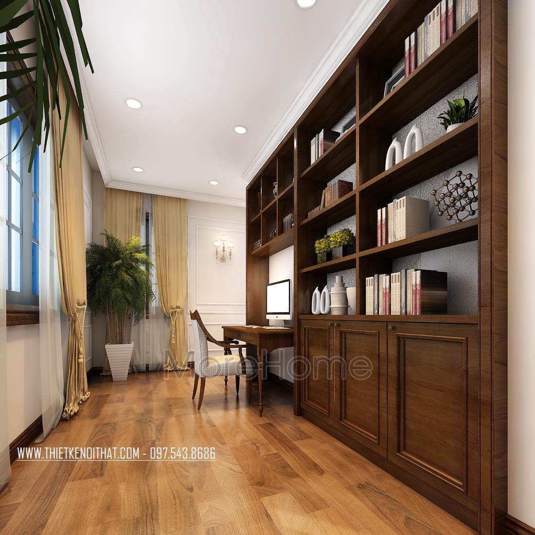 Tiếp theo là thiết kế nội thất phòng ngủ Master phong cách tân cổ điển. Điều dễ nhận thấy ở đây là thiết kế tích hợp nhiều không gian, từ nơi tiếp khách, không gian làm việc đến tủ quần áo và không giant hay đồ. Các khu vực không hề bị chia cắt bởi tường thô cứng nhắc mà thay vào đó là các thiết kế vách ngăn hoa văn tinh xảo, nhẹ nhàng vừa đảm bảo tính thẩm mỹ cho căn phòng mà vẫn giúp tiết kiệm diện tích sử dụng. Thiết kế đối xứng với tone màu nhẹ nhàng như xanh rêu, be, ghi sáng là các tone màu được kiến trúc sư lựa chọn cho căn phòng.