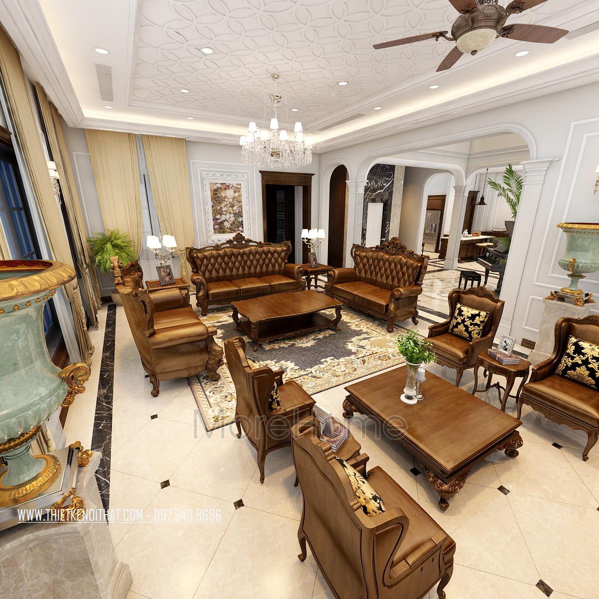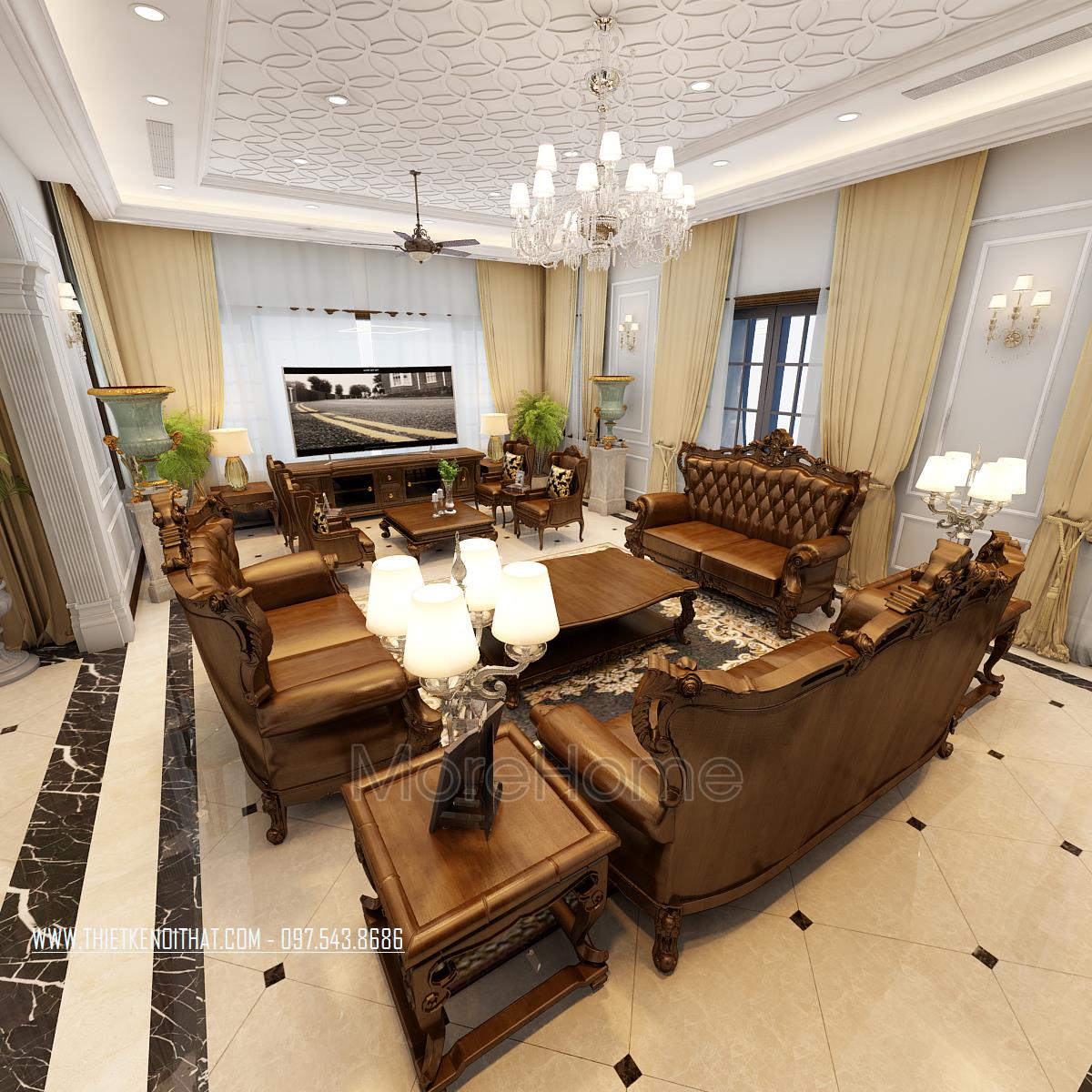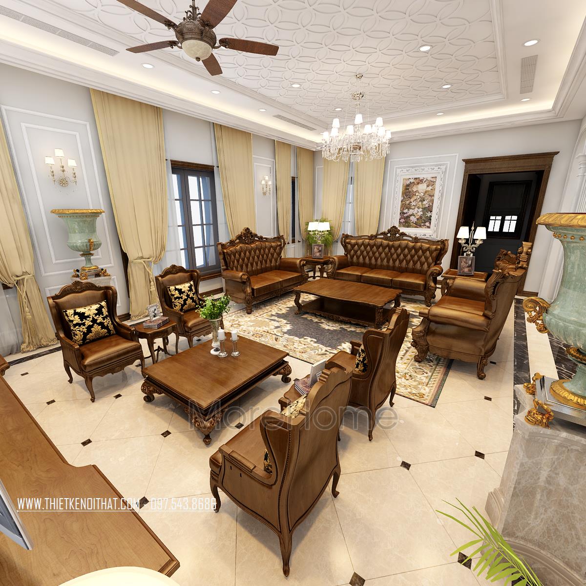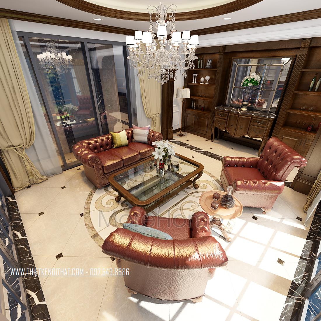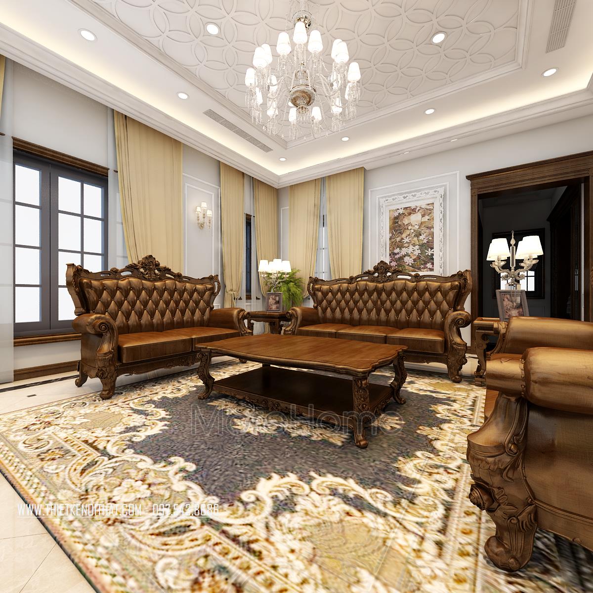 Thiết kế nội thất biệt thự Xuân Phương làm một trong những thiết kế nổi bật cho phong cách đó. Thiết kế nội thất phòng khách phong cách tân cổ điển sử dụng tone màu nâu trầm ấm áp làm chủ đạo gợi cảm giác gần gũi và thân thiện. Sắc nâu cổ điển cũng là một trong những màu sắc sang trọng thể hiện sự quý phái mà gia chủ ưa thích. Điểm nổi bật của không gian này chính là các thiết kế trạm khắc ấn tượng, không gian nội thất tân cổ điển đặc biệt sử dụng gỗ và da làm vật liệu chính cho thiết kế sofa. Bộ sofa to, rộng thể hiện sự bề thế của căn phòng.