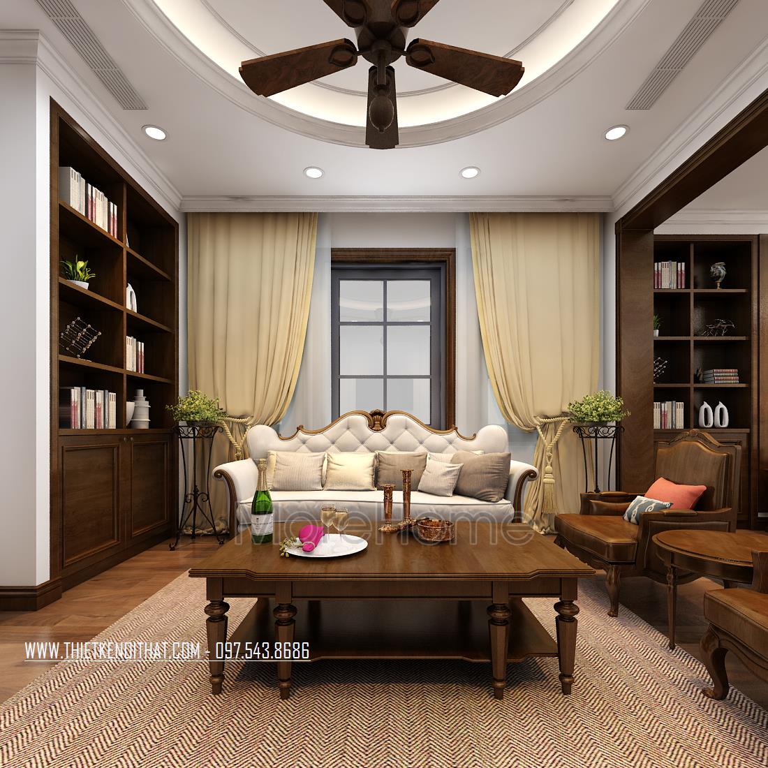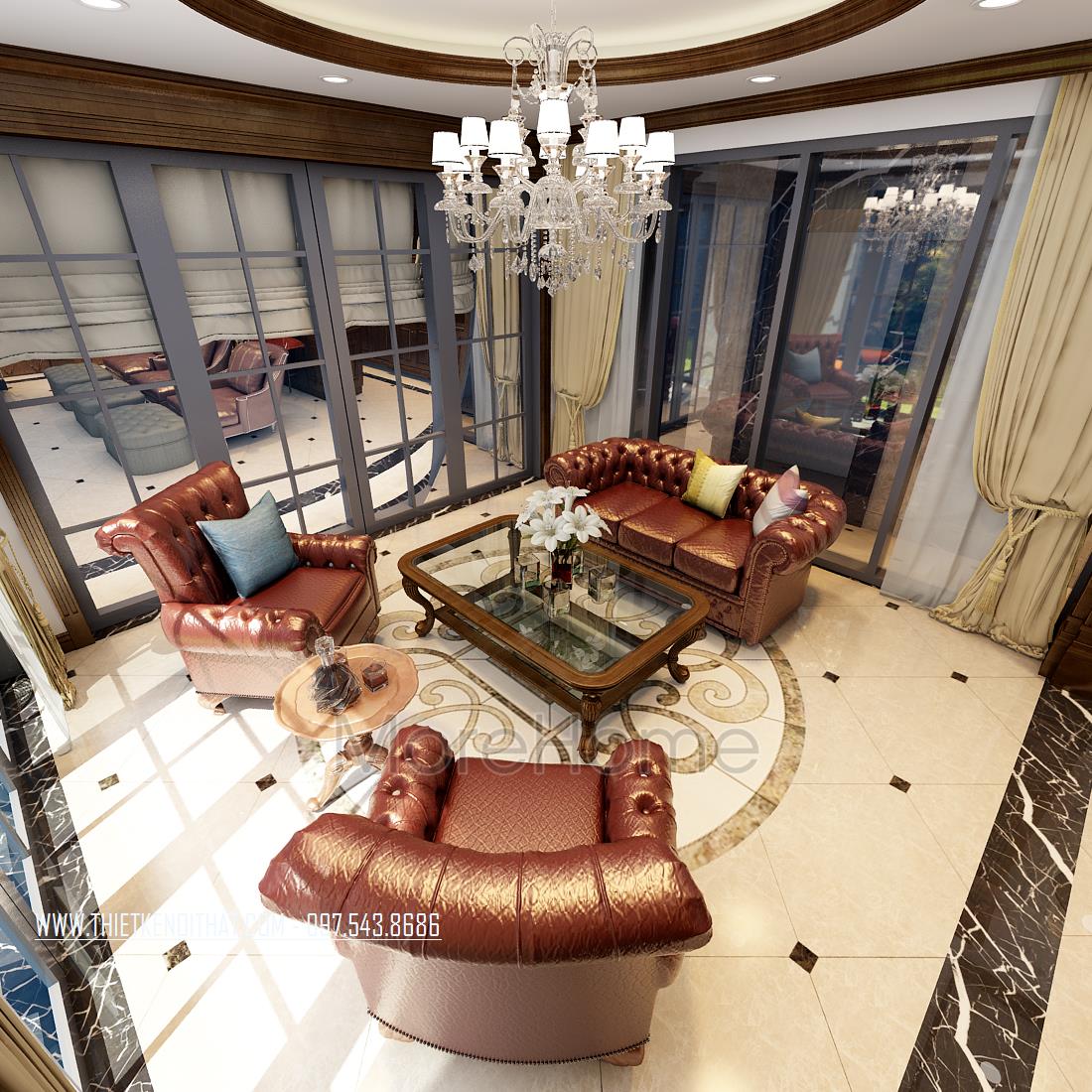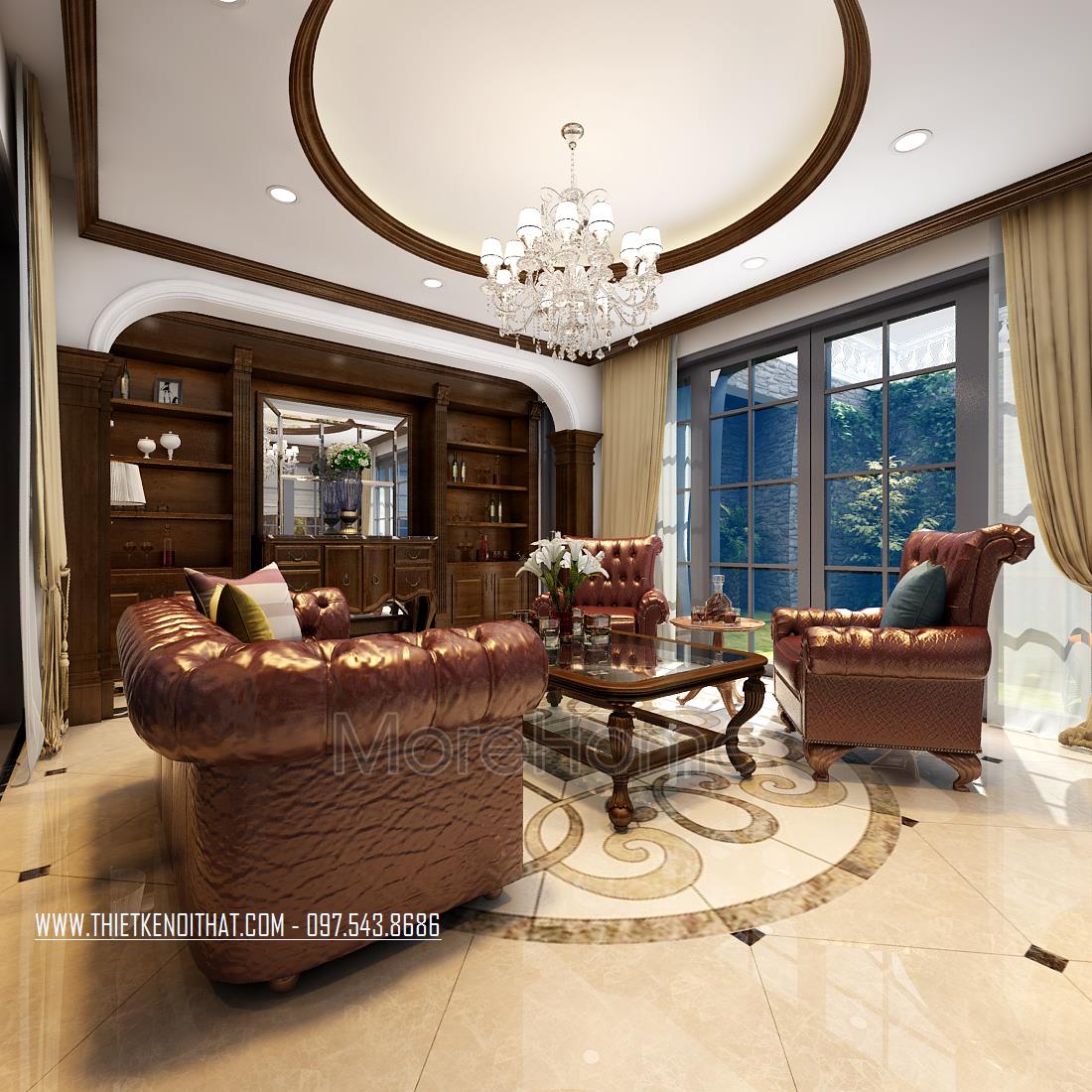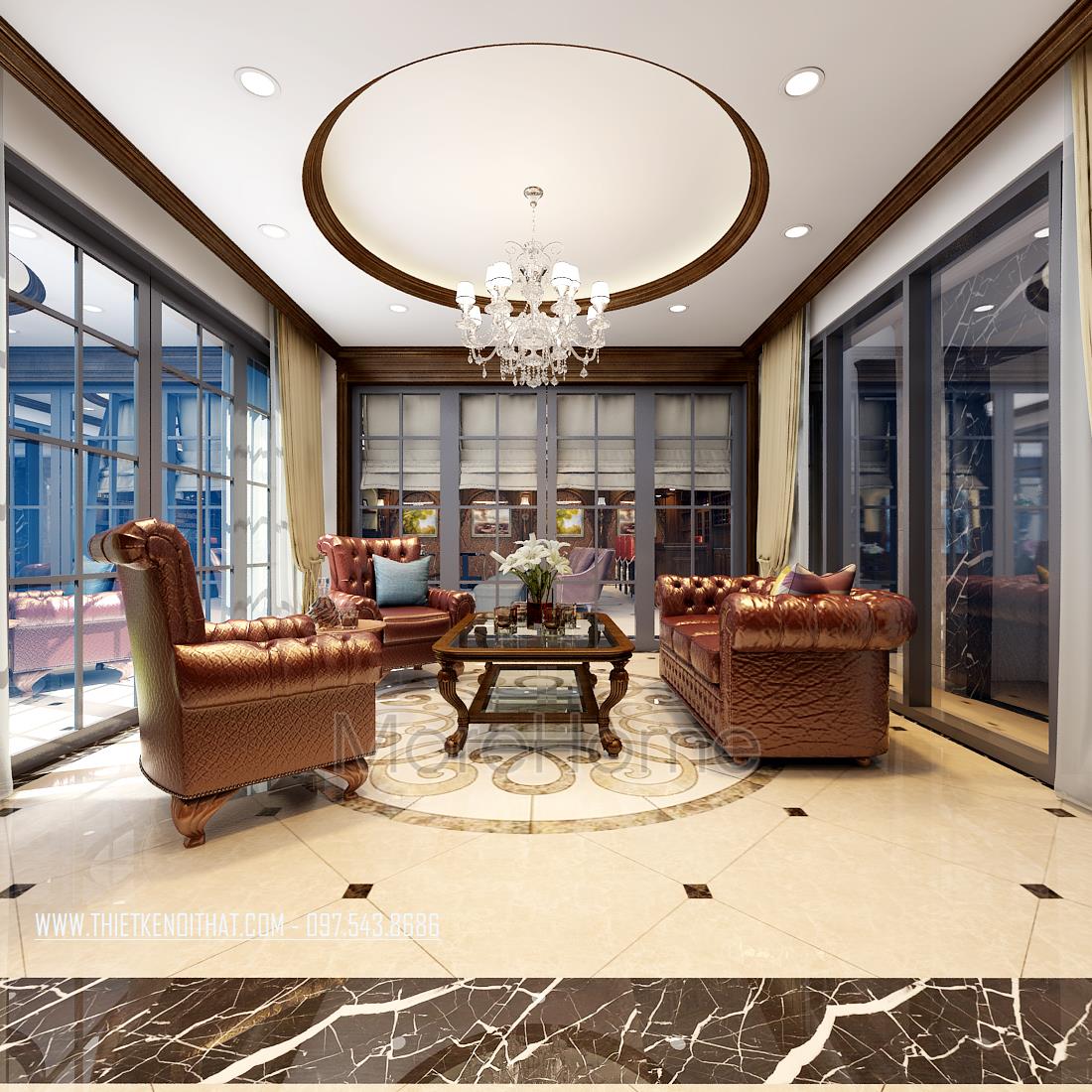 Thiết kế nội thất biệt thự Xuân Phương làm một trong những thiết kế nổi bật cho phong cách đó. Thiết kế nội thất phòng khách phong cách tân cổ điển sử dụng tone màu nâu trầm ấm áp làm chủ đạo gợi cảm giác gần gũi và thân thiện. Sắc nâu cổ điển cũng là một trong những màu sắc sang trọng thể hiện sự quý phái mà gia chủ ưa thích. Điểm nổi bật của không gian này chính là các thiết kế trạm khắc ấn tượng, không gian nội thất tân cổ điển đặc biệt sử dụng gỗ và da làm vật liệu chính cho thiết kế sofa. Bộ sofa to, rộng thể hiện sự bề thế của căn phòng.