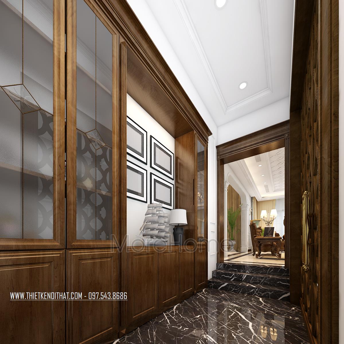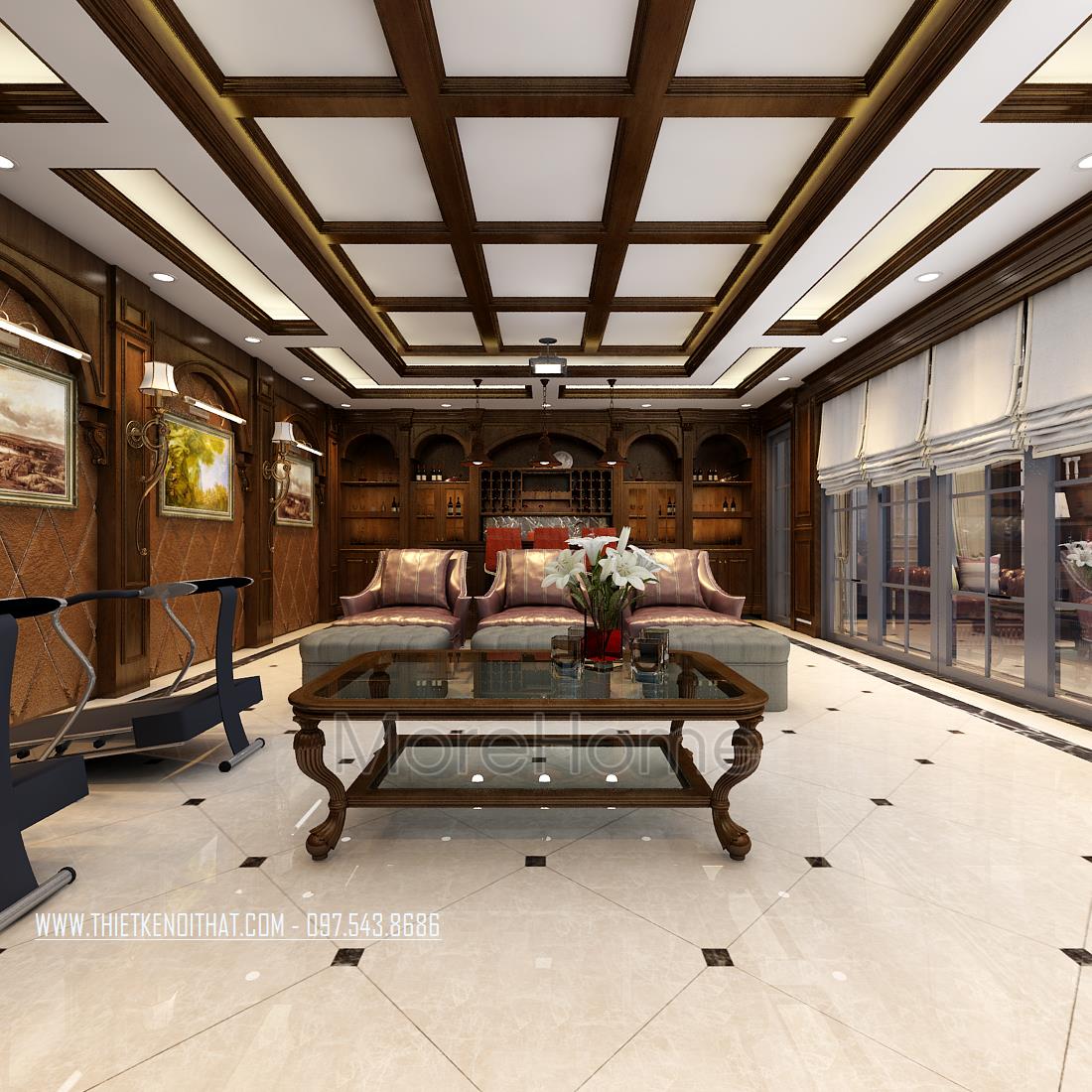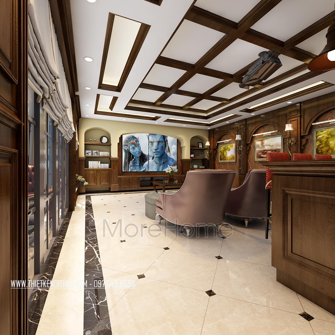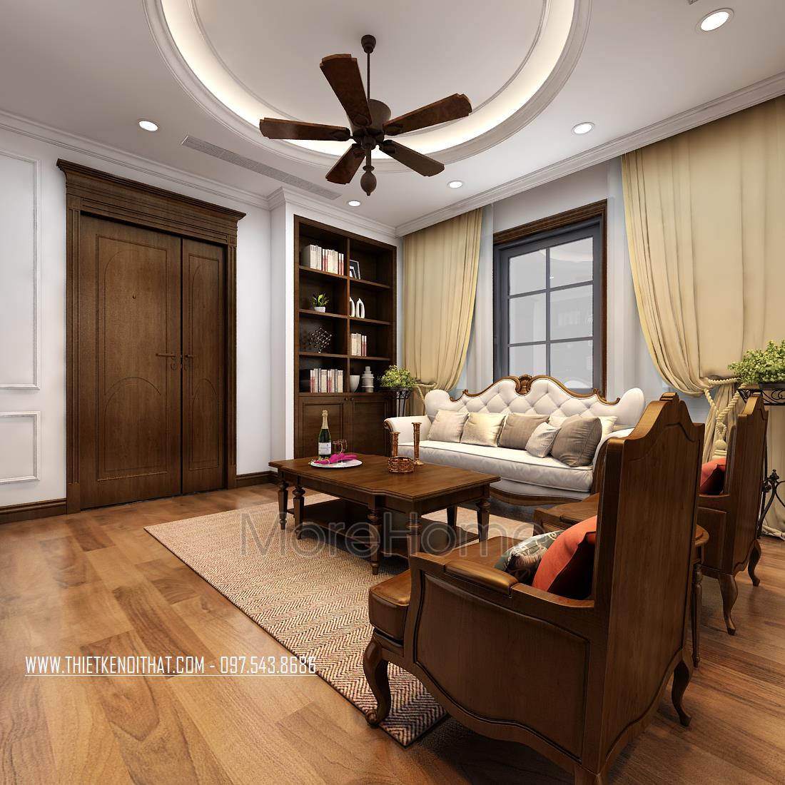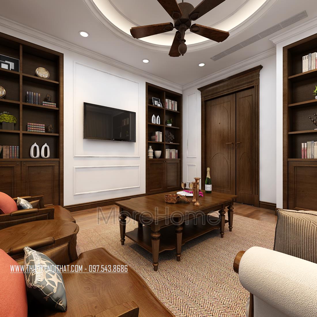 Thiết kế nội thất biệt thự Xuân Phương làm một trong những thiết kế nổi bật cho phong cách đó. Thiết kế nội thất phòng khách phong cách tân cổ điển sử dụng tone màu nâu trầm ấm áp làm chủ đạo gợi cảm giác gần gũi và thân thiện. Sắc nâu cổ điển cũng là một trong những màu sắc sang trọng thể hiện sự quý phái mà gia chủ ưa thích. Điểm nổi bật của không gian này chính là các thiết kế trạm khắc ấn tượng, không gian nội thất tân cổ điển đặc biệt sử dụng gỗ và da làm vật liệu chính cho thiết kế sofa. Bộ sofa to, rộng thể hiện sự bề thế của căn phòng.