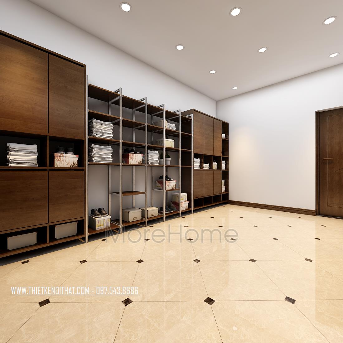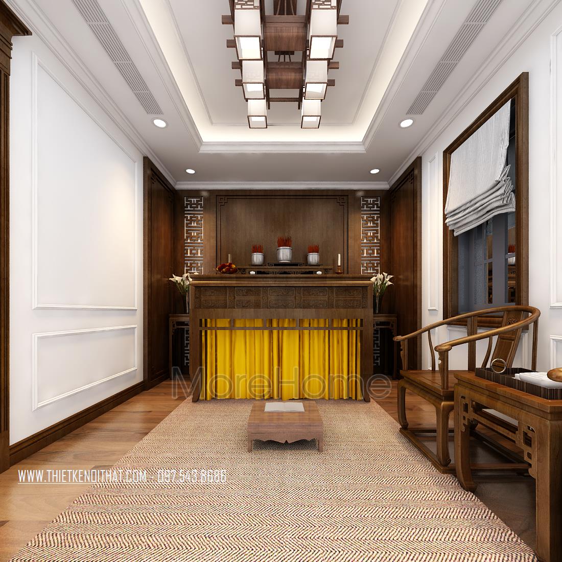 Cuối cùng là thiết kế nội thất không gian thờ cúng. Thiết kế không gian linh thiêng này được kiến trúc sư vô cùng cẩn trọng, từ việc kết hợp khéo léo các yếu tố thẩm mỹ đến cân nhắc cẩn thận các chi tiết liên quan đến phong thủy. Gỗ là vật liệu chính được sử dụng trong không gian này. Bàn thờ được đặt nghiêm trang với thiết kế đối xứng hai bên đảm bảo tính chất của không gian, gợi một nơi trang nghiêm, mang lại sự bình yên và thoải mái cho gia chủ.