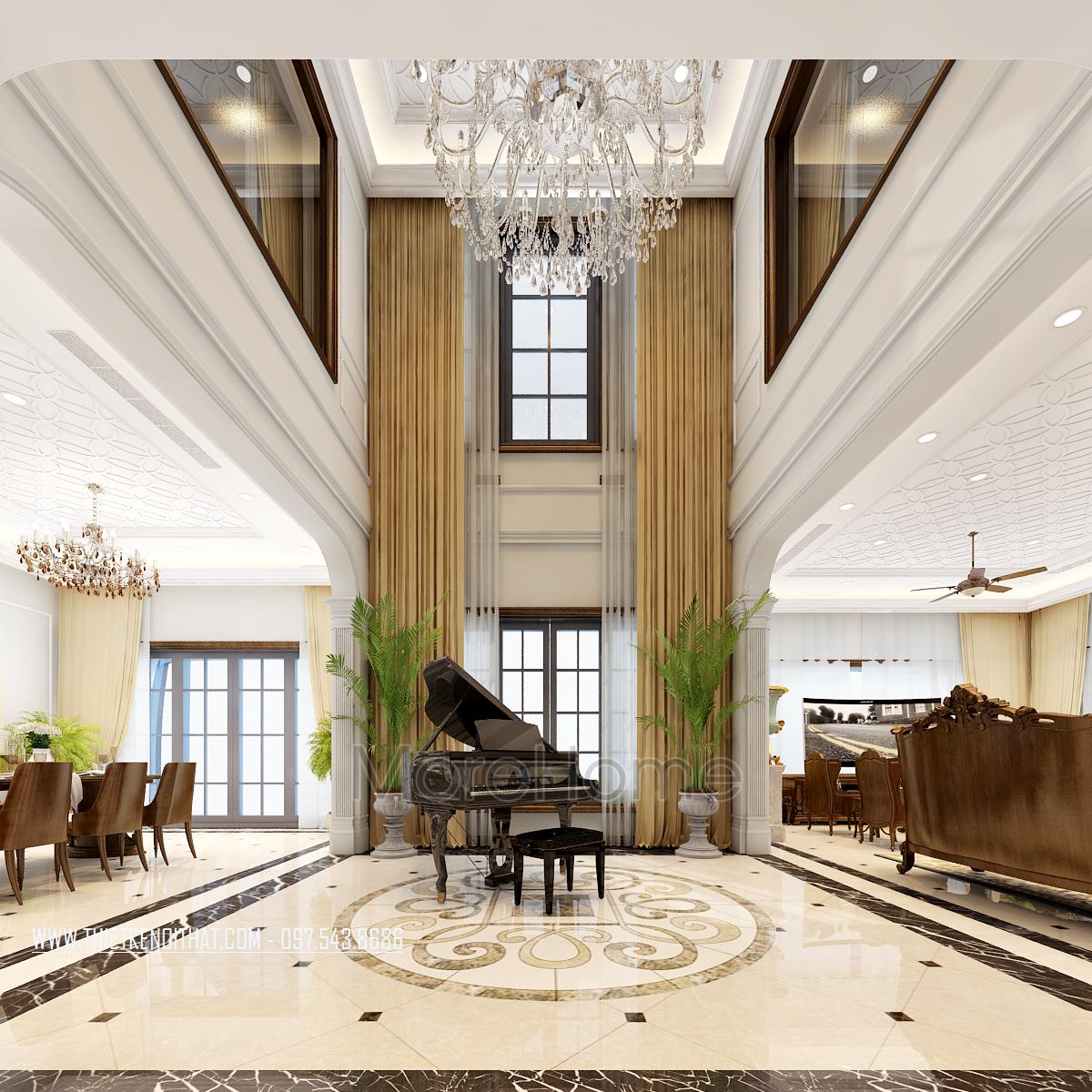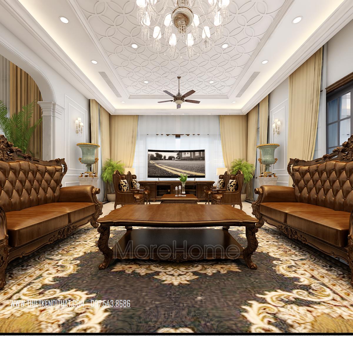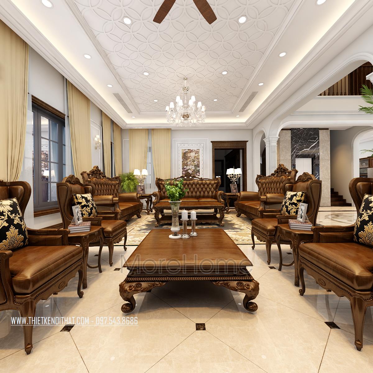 Không gian sinh hoạt được mở rộng, không hề bó hẹp trong bốn bức tường giúp kiến trúc sử thể hiện rõ lợi thế về mặt diện tích của căn nhà. Các chi tiết trang trí thêm như trần nhà khác biệt, thảm trải sàn với hoa văn thiết kế tỉ mỉ hay cách đặt các chậu cây nhỏ tạo không gian xanh,… đã tạo ra một không gian phòng khách hoàn hảo cho căn biệt thự.