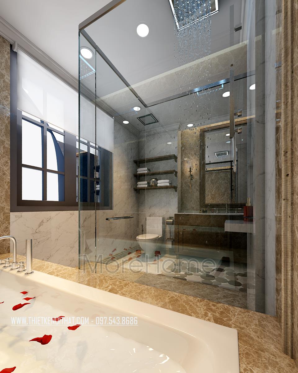 Thiết kế nội thất phòng tắm kết hợp nhà vệ sinh sử dụng hầu hết là các vật dụng có thiết kế đơn giản, không cầu kỳ về kiểu dáng hay trang trí, mang đến một không gian sang trọng, tạo cảm giác gọn gàng cho thiết kế. Các kệ, tủ là các thanh ngang gỗ giản đơn, bên cạnh đó kính, đá, và gương là các vật liệu có độ phản chiếu nhẹ giúp tạo cảm giác mở cho không gian hẹp.