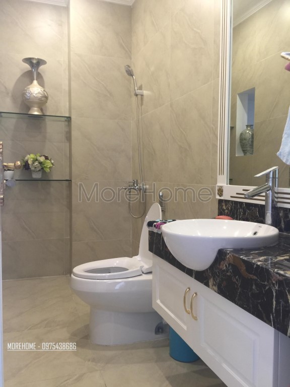 Phòng vệ sinh chung được thiết kế rất tiện dụng. Phần tường sử dụng gạch ốp với gam màu nhã nhặn, sạch sẽ. Lọ hoa mang tính trang trí, thổi hồn vào không gian thuần tính công năng.