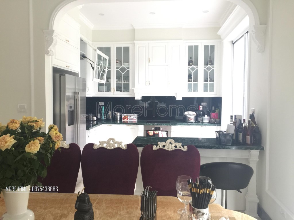 Thiết kế nội thất phòng bếp cũng được các kiến trúc sư của Morehome chú trọng để mang đến cho gia đình Anh Thiện một gian bếp nấu nướng thật tiện nghi. Với sự góp mặt của tủ bếp màu trắng tinh tế kết hợp với kính ốp bếp đen tuyền tạo nên một không gian vừa tinh tế, huyền ảo mà sang trọng.