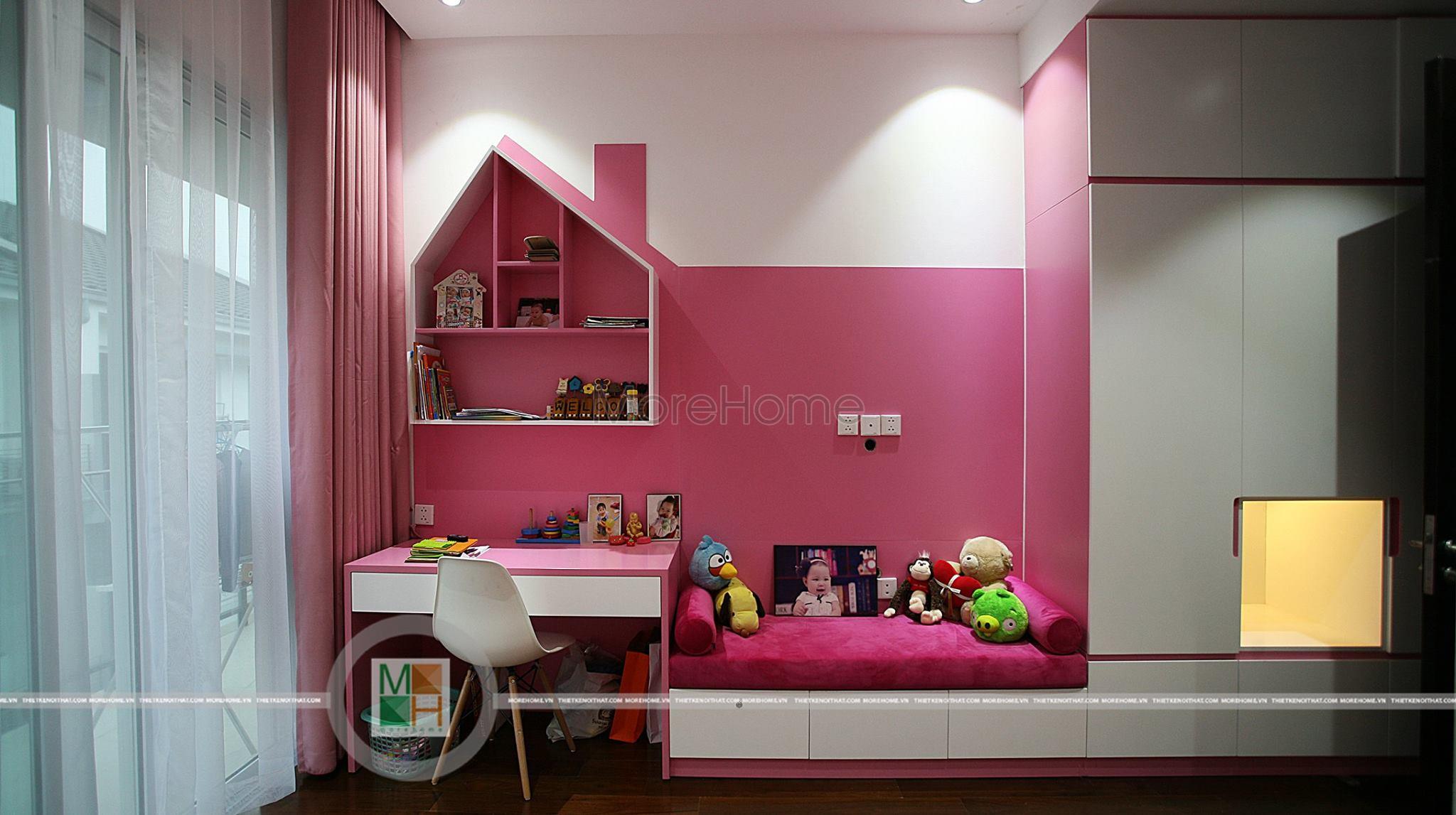 Phòng ngủ cho bé yêu nhà anh Hải cũng được thiết kế vô cùng ấn tượng với gam màu hồng làm tông màu chủ đạo, thể hiện sự đáng yêu, ngây thơ và rất dễ thương. Với một kệ sách và một chiếc bàn nhỏ sẽ giúp bé học tập và sáng tạo một cách đầy đủ nhất. Quả thật là một không gian vô cùng lý tưởng.