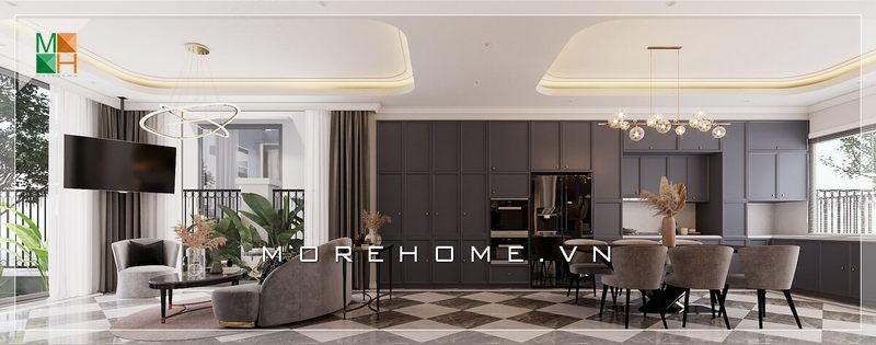 Xu hướng thiết kế phòng khách liền phòng ăn rất được ưa chuộng hiện nay. Hệ thống trần giật cấp và đèn chùm được thiết kế và bố trí ở các gian phòng khác nhau, như một cách để phân chia khu vực sinh hoạt