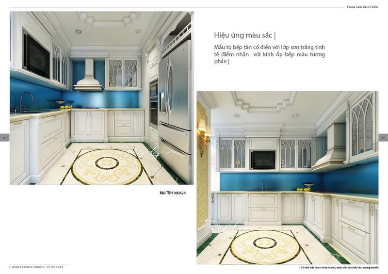Hiệu ứng ánh sáng thú vị thu hút mọi người đặt chân đến không gian phòng bếp từ sắc xanh nước biển đậm nổi bật cùng các chi tiết điêu khắc tỉ mỉ, nghệ thuật