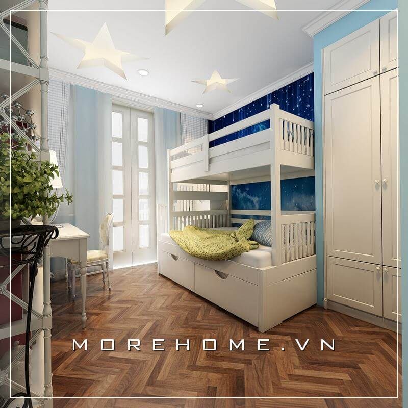 Để trang trí phòng ngủ của hai bé trai đẹp và tiện nghi, một chiếc giường tầng đa năng đã được lựa chọn phù hợp với không gian của căn hộ chung cư diện tích nhỏ.